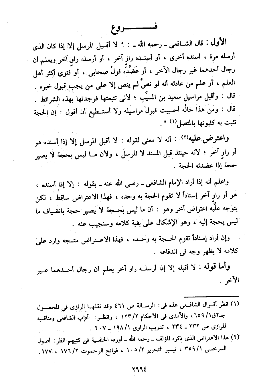 الأول: قال الشافعي - رحمه الله -: "لا أقبل المرسل إلا إذا كان الذي أرسله مرة، أسنده أخرى، أو أسنده راو آخر، أو أرسله راو آخر ويعلم أن رجال أحدهما غير رجال الآخر، أو عضده قول صحابي، أو فتوى أكثر أهل العلم، أو علم من عادته أنه لو نص لم ينص إلا على من يجب قبول خبره.