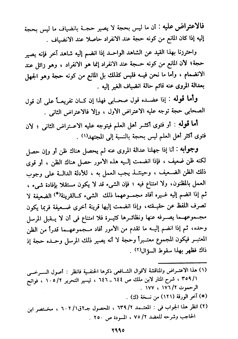 واحترزنا بهذا القيد عن الشاهد الواحد إذا انظم إليه شاهد آخر فإنه يصير حجة؛ لأن المانع من كونه حجة عند الانفراد إنما هو الانفراد، وهو زائل عند الانضمام، وأما ما نحن فيه فليس كذلك بل المانع من كونه حجة وهو الجهل بعدالة المروي عنه قائم حالة انضياف الغير إليه.