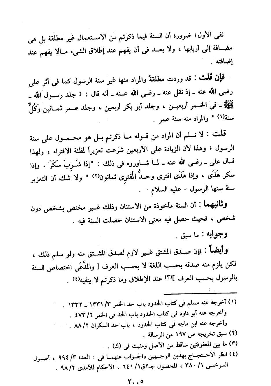 فإن قلت: قد وردت مطلقة والمراد منها غير سنة الرسول كما في أثر علي رضي الله عنه- إذ نقل عنه-رضي الله عنه- أنه قال: "جلد رسول الله- صلى الله عليه وسلم- في الخمر أربعين، وجلد أبو بكر أربعين، وجلد عمر ثمانين وكل سنة" والمراد منه سنة عمر.