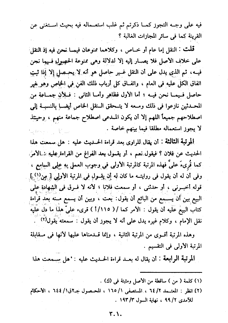 المرتبة الثالثة: أن يقال للراوي بعد قراءة الحديث عليه: هل سمعت هذا الحديث عن فلان؟ فيقول نعم، أو يقول بعد الفراغ من القراءة عليه الأمر كما قرئ علىَّ فهذه المرتبة كالمرتبة الأولى في وجوب العمل به على السامع، وفي أن له أن يقول في روايته ما كان له أن يقول في المرتبة الأولى] من [قوله أخبرني، أو حدثني، أو سمعت فلانًا؛ لأنه لا فرق في الشهادة على البيع بين أن يسمع من البائع أن يقول: بعت، وبين أن يسمع منه بعد قراءة كتاب البيع عليه أن يقول: الأمر كما/ (115/ أ) قرئ عليّ هذا ما دل عليه نقل الإمام، وكلام غيره يدل على أنه لا يجوز أن يقول: سمعته يقول.