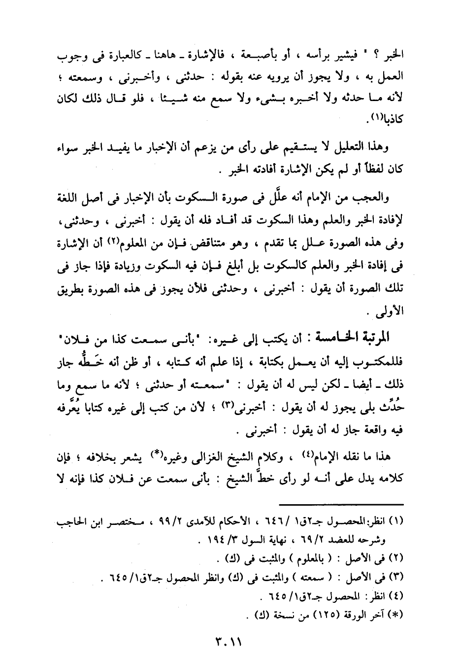 والعجب من الإمام أنه علل في صورة السكوت بأن الإخبار في أصل اللغة لإفادة الخبر والعلم وهذا السكوت قد أفاد فله أن يقول: أخبرني، وحدثني، وفي هذه الصورة علل بما تقدم، وهو متناقض فإن من المعلوم أن الإشارة في إفادة الخبر والعلم كالسكوت بل أبلغ فإن فيه السكوت وزيادة فإذا جاز في تلك الصورة أن يقول: أخبرني، وحدثني فلأن يجوز في هذه الصورة بطريق الأولى.