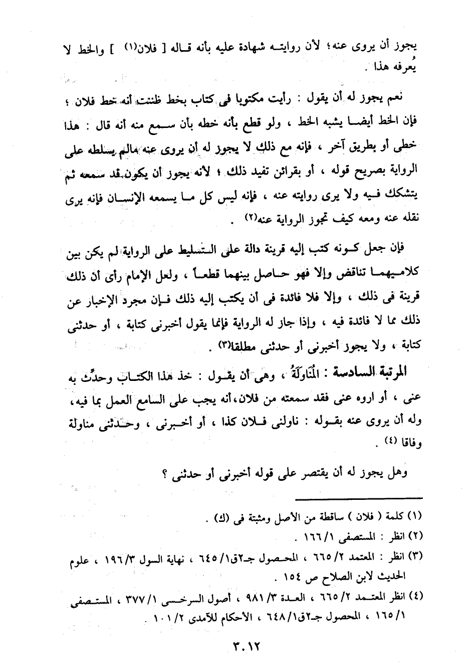 المرتبة السادسة: المناولة، وهي أن يقول: خذ هذا الكتاب وحدث به عني، أو اروه عني فقد سمعته من فلان، أنه يجب على السامع العمل بما فيه، وله أن يروى عنه بقوله: ناولني فلان كذا، أو أخبرني، وحدثني مناولة وفاقا.