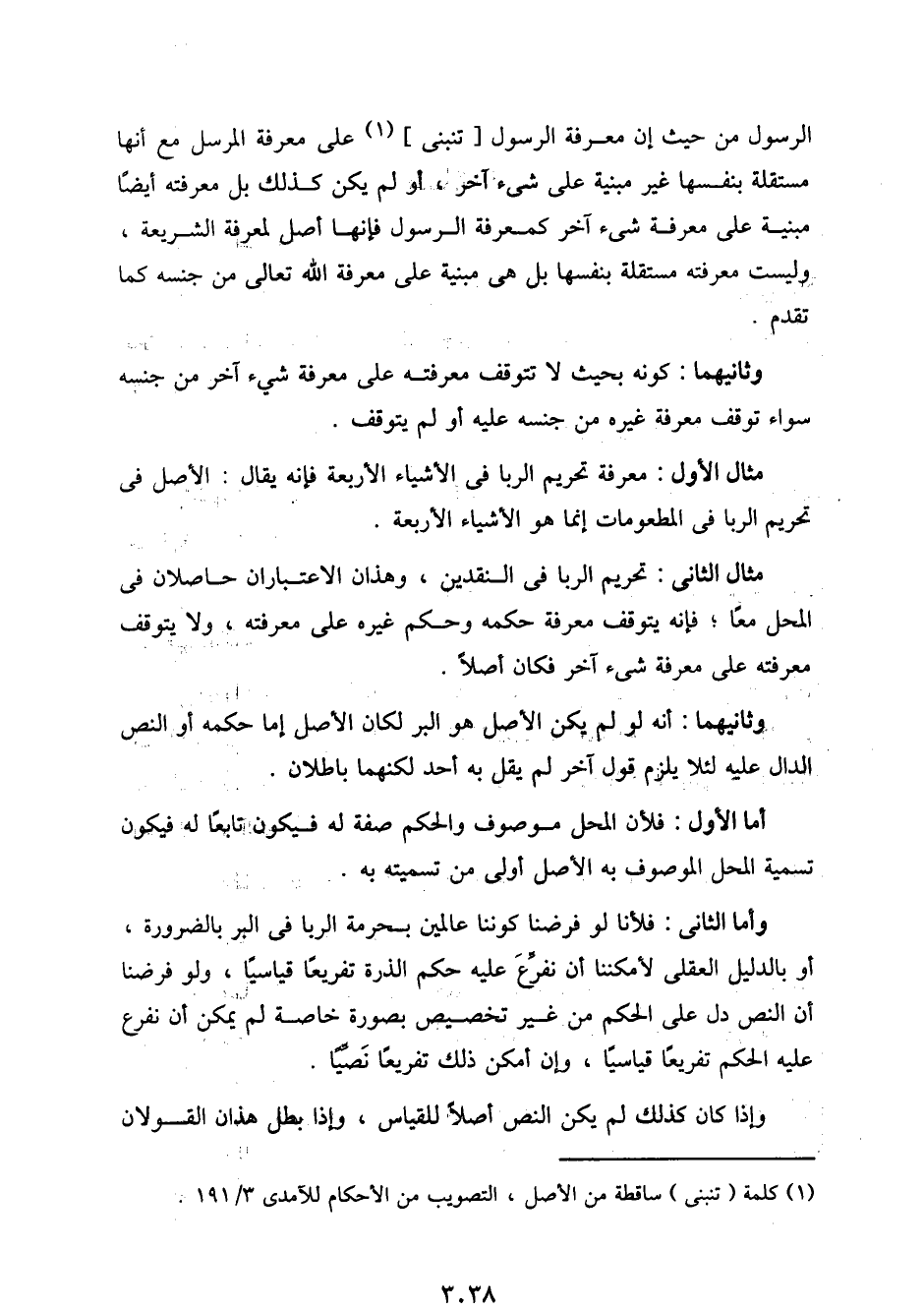 الرسول من حيث إن معرفة الرسول [تنبني] على معرفة المرسل مع أنها مستقلة بنفسها غير مبنية على شيء آخر، أو لم يكن كذلك بل معرفته أيضًا مبنية على معرفة شيء آخر كمعرفة الرسول فإنها أصل لمعرفة الشريعة، وليست معرفته مستقلة بنفسها بل هي مبنية على معرفة الله تعالى من جنسه كما تقدم.