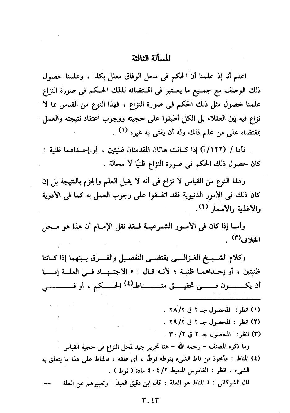 اعلم أنا إذا علمنا أن الحكم في محل الوفاق معلل بكذا، وعلمنا حصول ذلك الوصف مع جميع ما يعتبر في اقتضائه لذلك الحكم في صورة النزاع علمنا حصول مثل ذلك الحكم في صورة النزاع، فهذا النوع من القياس مما لا نزاع فيه بين العقلاء بل الكل أطبقوا على حجيته ووجوب اعتقاد نتيجته والعمل بمقتضاه على من علم ذلك وله أن يفتي به غيره.