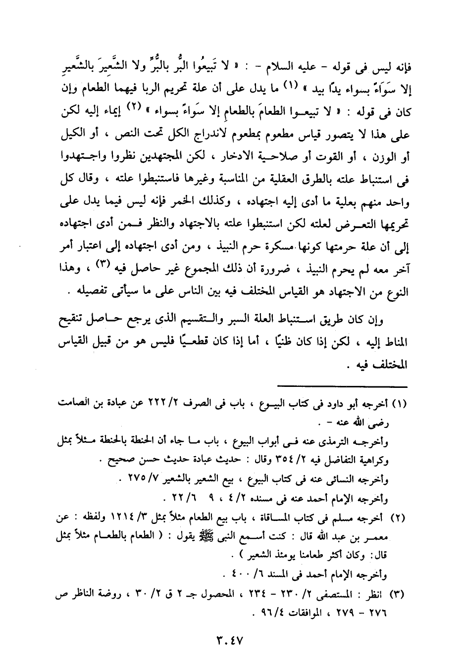 فإنه ليس في قوله- عليه السلام-: "لا تبيعوا البر بالبر ولا الشعير بالشعير إلا سواء بسواء يدًا بيد" ما يدل على أن علة تحريم الربا فيهما الطعام وإن كان قوله: "لا تبيعوا الطعام بالطعام إلا سواًء بسواء" إيماء إليه لكن على هذا لا يتصور قياس مطعوم بمطعوم لاندراج الكل تحت النص، أو الكيل أو الوزن، أو القوت أو صلاحية الادخار، لكن المجتهدين نظروا واجتهدوا في استنباط علته بالطرق العقلية من المناسبة وغيرها فاستنبطوا علته، وقال كل واحد منهم بعلية مما أدى إليه اجتهاده، وكذلك الخمر فإنه ليس فيما يدل على تحريمها التعرض لعلته لكن استنبطوا علته بالاجتهاد والنظر فمن أدى اجتهاده إلى أن علة حرمتها كونها مسكرة حرم النبيذ، ومن أدى اجتهاده إلى اعتبار أمر آخر معه لم يحرم النبيذ، ضرورة أن ذلك المجموع غير حاصل فيه، وهذا النوع من الاجتهاد هو القياس المختلف فيه بين الناس على ما سيأتي من تفصيله.