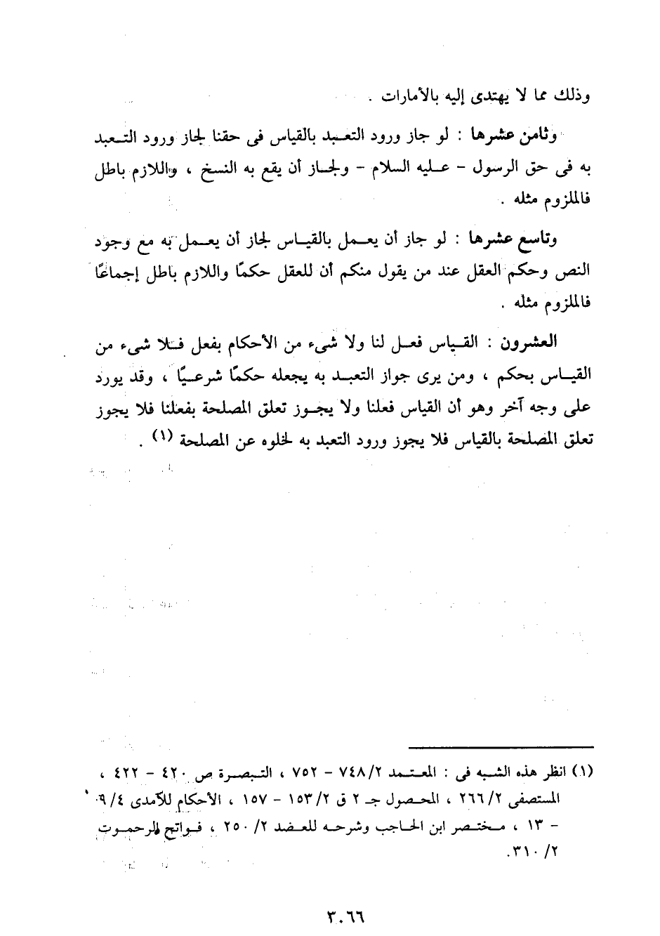 العشرون: القياس فعل لنا ولاشيء من الأحكام بفعل فلا شيء من القياس بحكم، ومن يرى جواز التعبد به يجعله حكمًا شرعيًا، وقد يورد على وجه آخر وهو أن القياس فعلنا ولا يجوز تعلق المصلحة بفعلنا فلا يجوز تعلق المصلحة بالقياس فلا يجوز ورود التعبد به لخلوه عن المصلحة.
