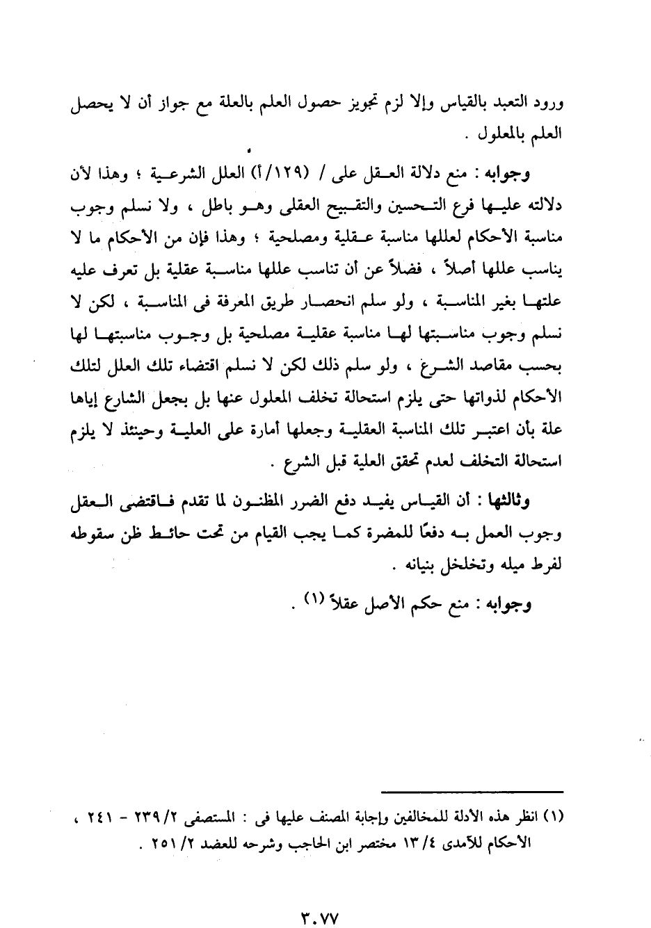وجوابه: منع دلالة العقل على/ (129/ أ) العلل الشرعية؛ وهذا لأن دلالته عليها فرع التحسين والتقبيح العقلي وهو باطل، ولا نسلم وجوب مناسبة الأحكام لعللها مناسبة عقلية ومصلحية؛ وهذا فإن من الأحكام ما لا يناسب عللها أصلًا، فضلًا عن أن تناسب عللها مناسبة عقلية بل تعرف عليه علتها بغير المناسبة، ولو سلم انحصار طريق المعرفة في المناسبة، لكن لا نسلم وجوب مناسبتها لها مناسبة عقلية مصلحية بل وجوب مناسبتها لها بحسب مقاصد الشرع، ولو سلم ذلك لكن لا نسلم اقتضاء تلك العلل لتلك الأحكام لذواتها حتى يلزم استحالة تخلف المعلول عنها بل بجعل الشارع إياها علة بأن اعتبر تلك المناسبة العقلية وجعلها أمارة على العلية وحينئذ لا يلزم استحالة التخلف لعدم تحقيق العلية قبل الشرع.