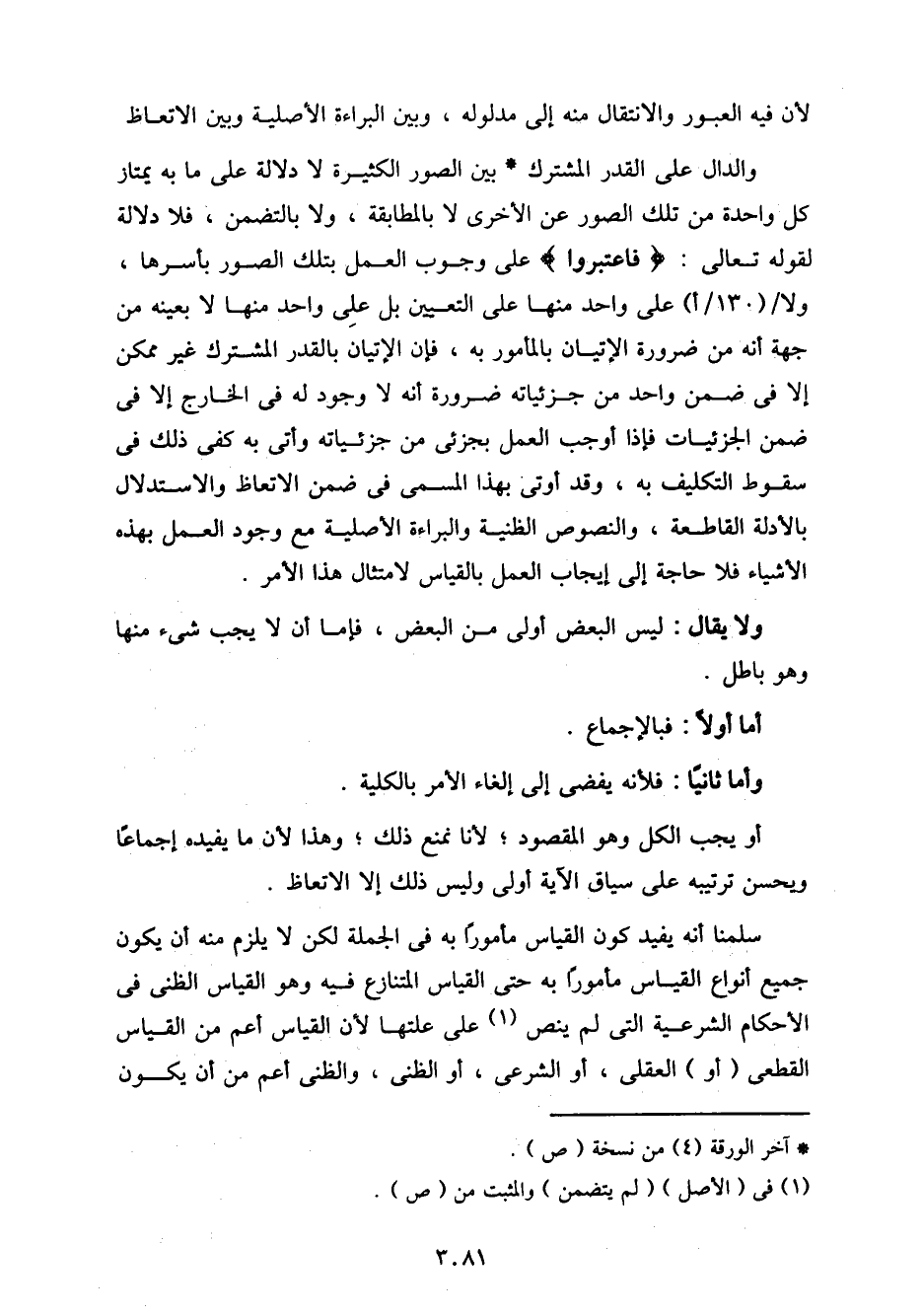 لأن فيه العبور والانتقال منه إلى مدلوله، وبين البراءة الأصلية وبين الاتعاظ والدال على القدر المشترك بين الصور الكثيرة لا دلالة على ما به يمتاز كل واحدة من تلك الصور عن الأخرى لا بالمطابقة، ولا بالتضمن، فلا دلالة لقوله تعالى: {فاعتبروا} على وجوب العمل بتلك الصور بأسرها، ولا/ (???/ أ) على واحد منها علي التعيين بل على واحد منها لا بعينه من جهة أنه من ضرورة الإتيان بالمأمور به، فإن الإتيان بالقدر المشترك غير ممكن إلا في ضمن واحد من جزئياته ضرورة أنه لا وجود له في الخارج إلا في ضمن الجزئيات فإذا أوجب العمل بجزئي من جزئياته وأتى به كفى ذلك في سقوط التكليف به، وقد أوتي بهذا المسمى في ضمن الاتعاظ والاستدلال بالأدلة القاطعة، والنصوص الظنية والبراءة الأصلية مع وجود العمل بهذه الأشياء فلا حاجة إلى إيجاب العمل بالقياس لامتثال هذا الأمر.