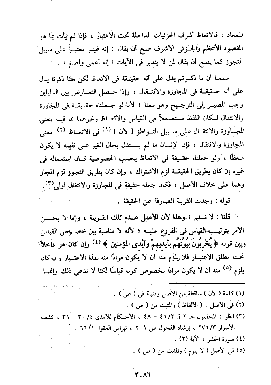 سلمنا أن ما ذكرتم يدل على أنه حقيقة في الاتعاظ لكن ما ذكرنا يدل على حقيقة في المجاوزة والانتقال، وإذا حصل التعارض بين الدليلين وجب المصير إلى الترجيح وهو معنا؛ لأنا لو جعلناه حقيقة في المجاوزة والانتقال لكان اللفظ مستعملًا في القياس والاتعاظ وغيرهما مما فيه معنى المجاوزة والانتقال على سبيل التواطؤ [لأن] في الاتعاظ معنى المجاوزة والانتقال، فإن الإنسان ما لم يستدل بحال الغير على نفسه لا يكون متعظًا، ولو جعلناه حقيقة في الاتعاظ بحسب الخصوصية كان استعماله في غيره إن كان بطريق الحقيقة لزم الاشتراك، وإن كان بطريق التجوز لزم المجاز وهما على خلاف الأصل، فكان جعله حقيقة في المجاوزة والانتقال أولى.