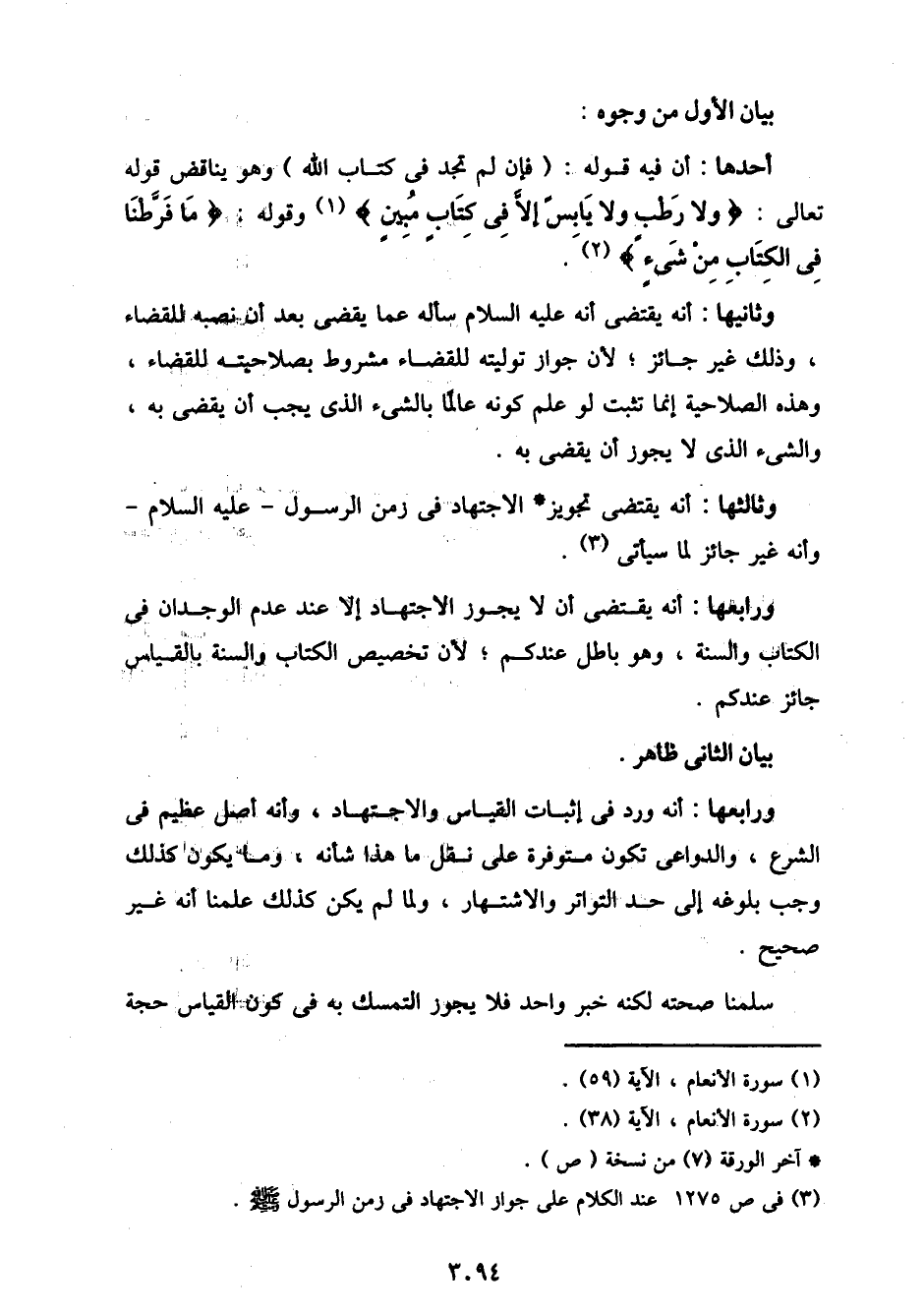ورابعها: أنه يقتضي أن لا يجوز الاجتهاد إلا عند عدم الوجدان في الكتاب والسنة، وهو باطل عندكم؛ لأن تخصيص الكتاب والسنة بالقياس جائز عندكم.