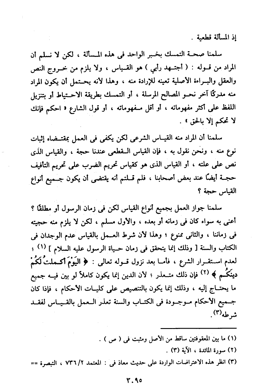 سلمنا جواز العمل بجميع أنواع القياس لكن في زمان الرسول أو مطلقًا؟ أعنى به سواء كان في زمانه أو بعده، والأول مسلم، لكن لا يلزم منه حجيته في زماننا، والثاني ممنوع؛ وهذا لأن شرط العمل بالقياس عدم الوجدان في الكتاب والسنة [وذلك إنما يتحقق في زمان حياة الرسول عليه السلام]؛ لعدم استقرار الشرع، فأما بعد نزول قوله تعالى: {اليوم أكملت لكم دينكم} فإن ذلك متعذر؛ لأن الدين إنما يكون كاملًا لو بين فيه جميع ما يحتاج إليه، وذلك إنما يكون بالتنصيص على كليات الأحكام، فإذا كان جميع الأحكام موجودة في الكتاب والسنة تعذر بالقياس لفقد شرطه.