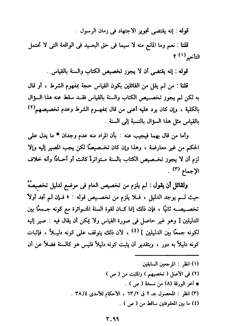 ولقائل أن يقول: لم يلزم من تخصيص العام في موضع لدليل تخصيصه حيث لم يوجد الدليل، فلا يلزم من تخصيص قوله: "فإن لم تجد أولًا تخصيصه ثانيًا، فإن ذلك إنما كان لقوه السنة المتواترة مع كونه جمعًا بين الدليلين [وهو غير حاصل في صورة القياس ولا يمكن أن يقال فيه: صير إليه لكونه جمعًا بين الدليلين]، لأن ذلك يتوقف على كونه دليلًا، فإثبات كونه دليلًا به دور، وبتقدير أن يثبت كونه دليلًا فليس هو كالسنة فضلًا عن أن