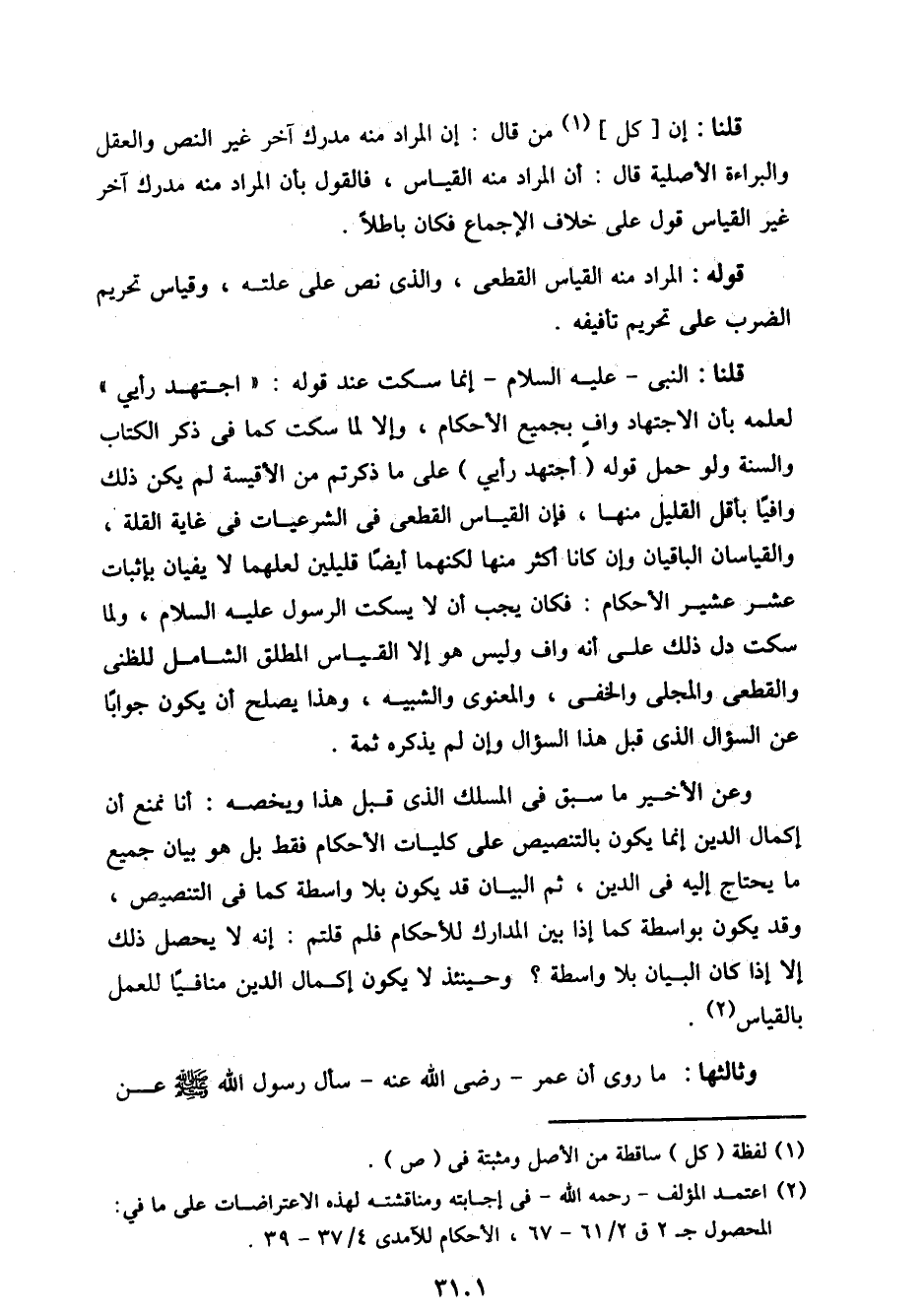قلنا: النبي- علية السلام- إنما سكت عند قوله: "اجتهد رأيي" لعلمه بأن الاجتهاد واف بجميع الأحكام، وإلا لما سكت كما في ذكر الكتاب والسنة ولو حمل قوله (أجتهد رأيي) على ما ذكرتم من الأقيسة لم يكن ذلك وافيًا بأقل القليل منها، فإن القياس القطعي في الشرعيات في غاية القلة، والقياسان الباقيان وإن كانا أكثر منها لكنهما أيضًا قليلين لعلهما لا يفيان بإثبات عشر عشير الأحكام: فكان يجب أن لا يسكت الرسول علية السلام، ولما سكت دل ذلك على أنه واف وليس هو إلا القياس المطلق الشامل للظني والقطعي والمجلي والخفي، والمعنوي والشبيه، وهذا يصلح أن يكون جوابًا عن السؤال الذي قبل هذا السؤال وإن لم يذكره ثمة.