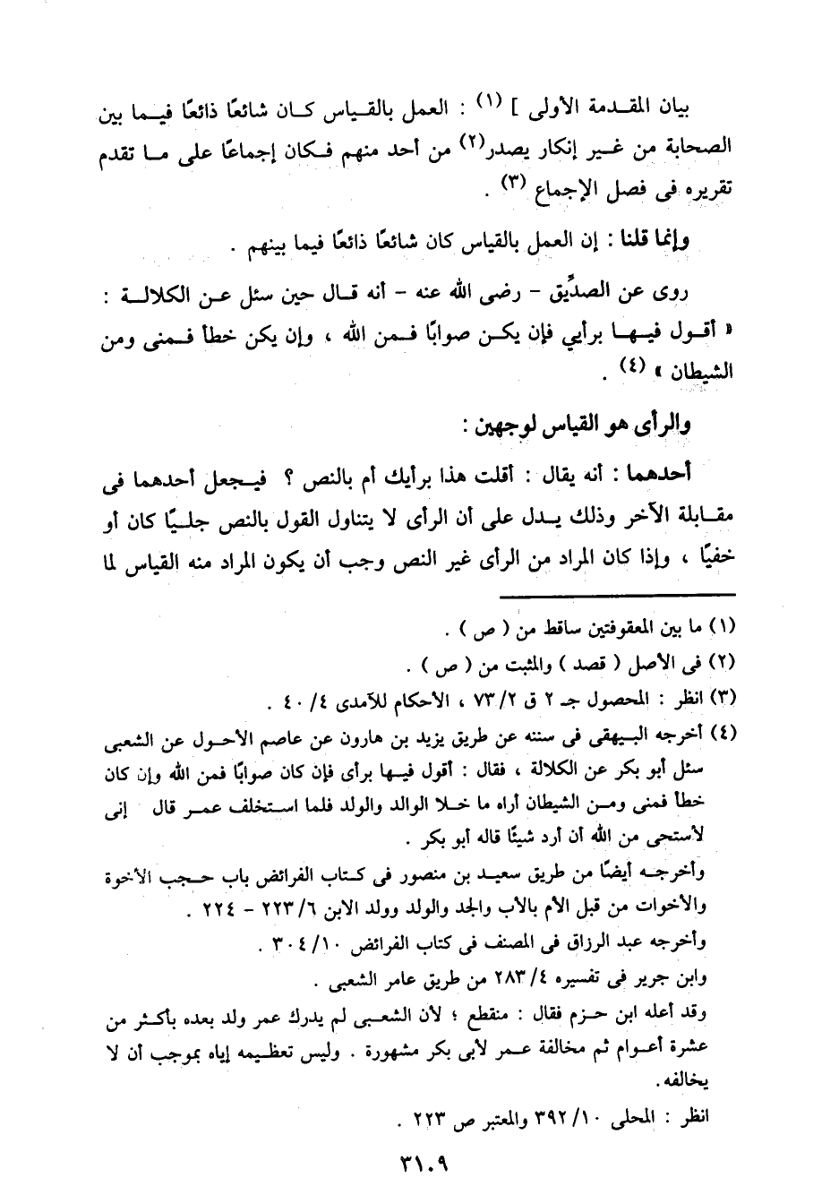 روي عن الصديق- رضي الله عنه- أنه قال حين سئل عن الكلالة: "أقول فيها برأيي فإن يكن صوابًا فمن الله، وإن يكن خطأ فمني ومن الشيطان".
