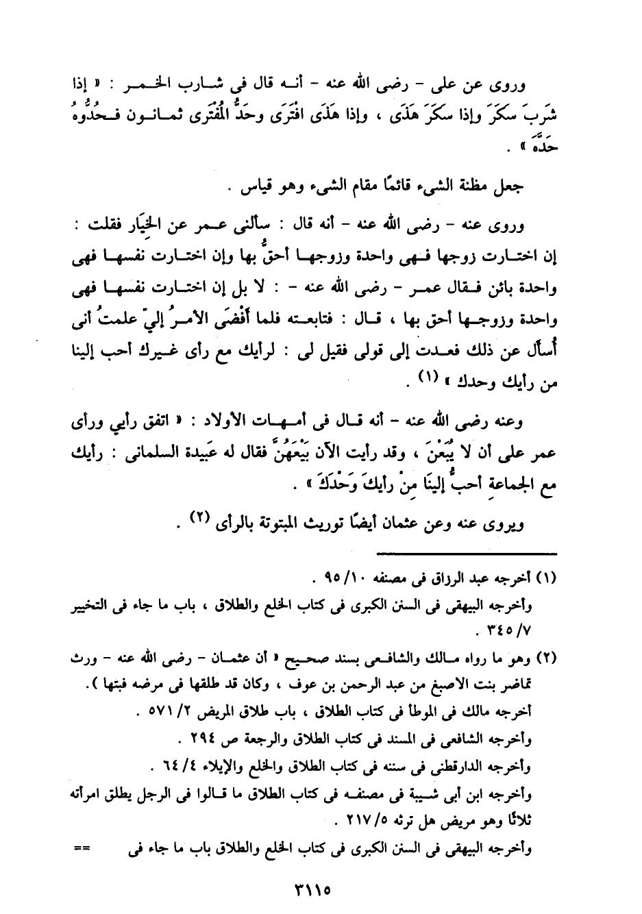 وروى عنه- رضي الله عنه- أنه قال: سألني عمر عن الخيار فقلت: إن اختارت زوجها فهي واحدة وزوجها أحق بها وإن اختارت نفسها فهي واحده بائن فقال عمر- رضي الله عنه-: لا بل إن اختارت نفسها فهي واحدة وزوجها أحق بها، قال: فتابعته فلما أفضى الأمر إلي علمت أني أسأل عن ذلك فعدت إلى قولي فقيل لي: لرأيك مع رأي غيرك أحب إلينا من رأيك وحدك".