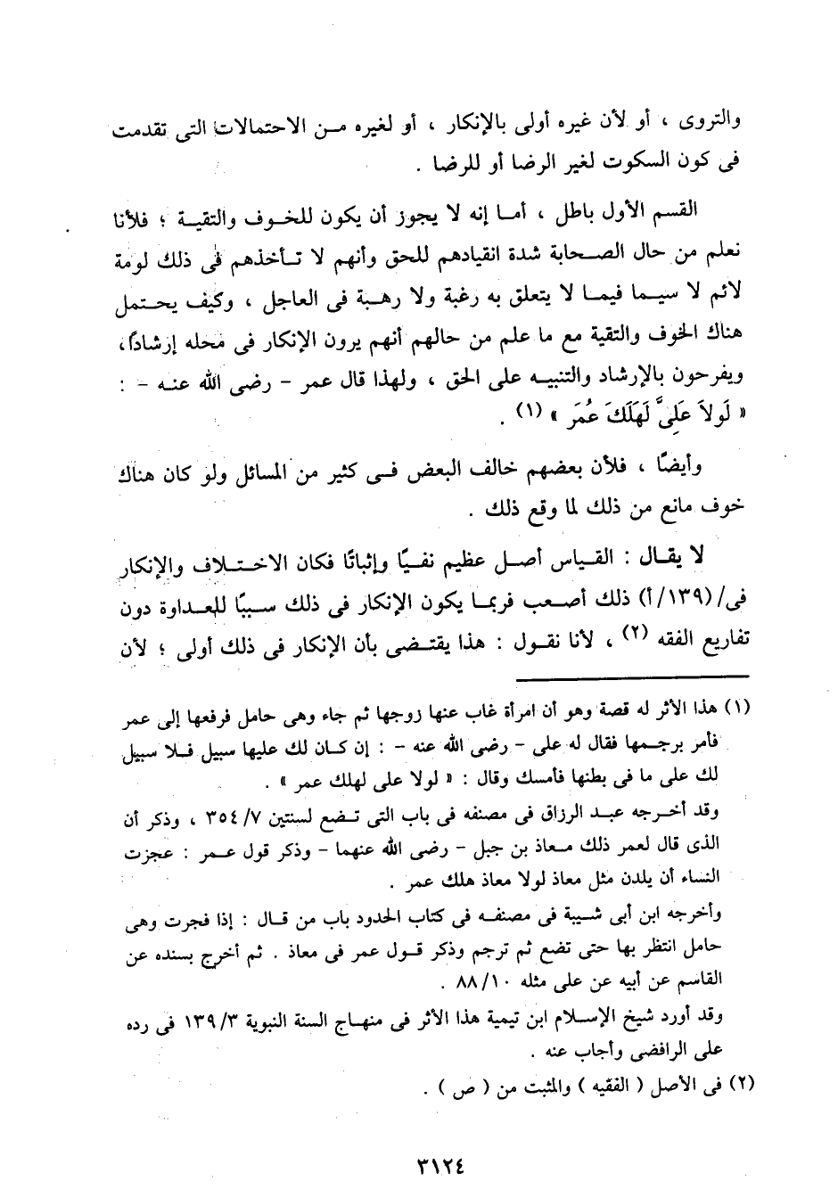 القسم الأول باطل، أما أنه لا يجوز أن يكون للخوف والتقية؛ فلأنا نعلم من حال الصحابة شدة انقيادهم للحق وأنهم لا تأخذهم في ذلك لومة لائم لاسيما فيما لا يتعلق به رغبة ولا رهبة في العاجل، وكيف يحتمل هناك الخوف والتقية مع ما علم من حالهم أنهم يرون الإنكار في محله إرشادًا، ويفرحون بالإرشاد والتنبيه على الحق، ولهذا قال عمر- رضي الله عنه-: "لولا علي لهلك عمر".