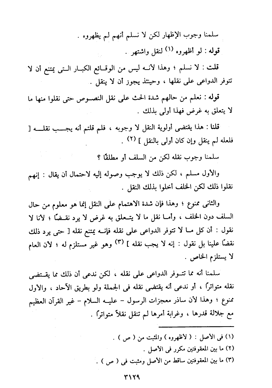 والثاني ممنوع؛ وهذا فإن شدة الاهتمام على النقل إنما هو معلوم من حال السلف دون الخلف، وأما نقل ما لا يتعلق به غرض لا يرد نقضًا؛ لأنا لا نقول: أن كل ما لا تتوفر الدواعي على نقله فإنه يمتنع نقله [حتى يرد ذلك نقضًا علينا بل نقول: إنه لا يجب نقله] وهو غير مستلزم له؛ لأن العام لا يستلزم الخاص.