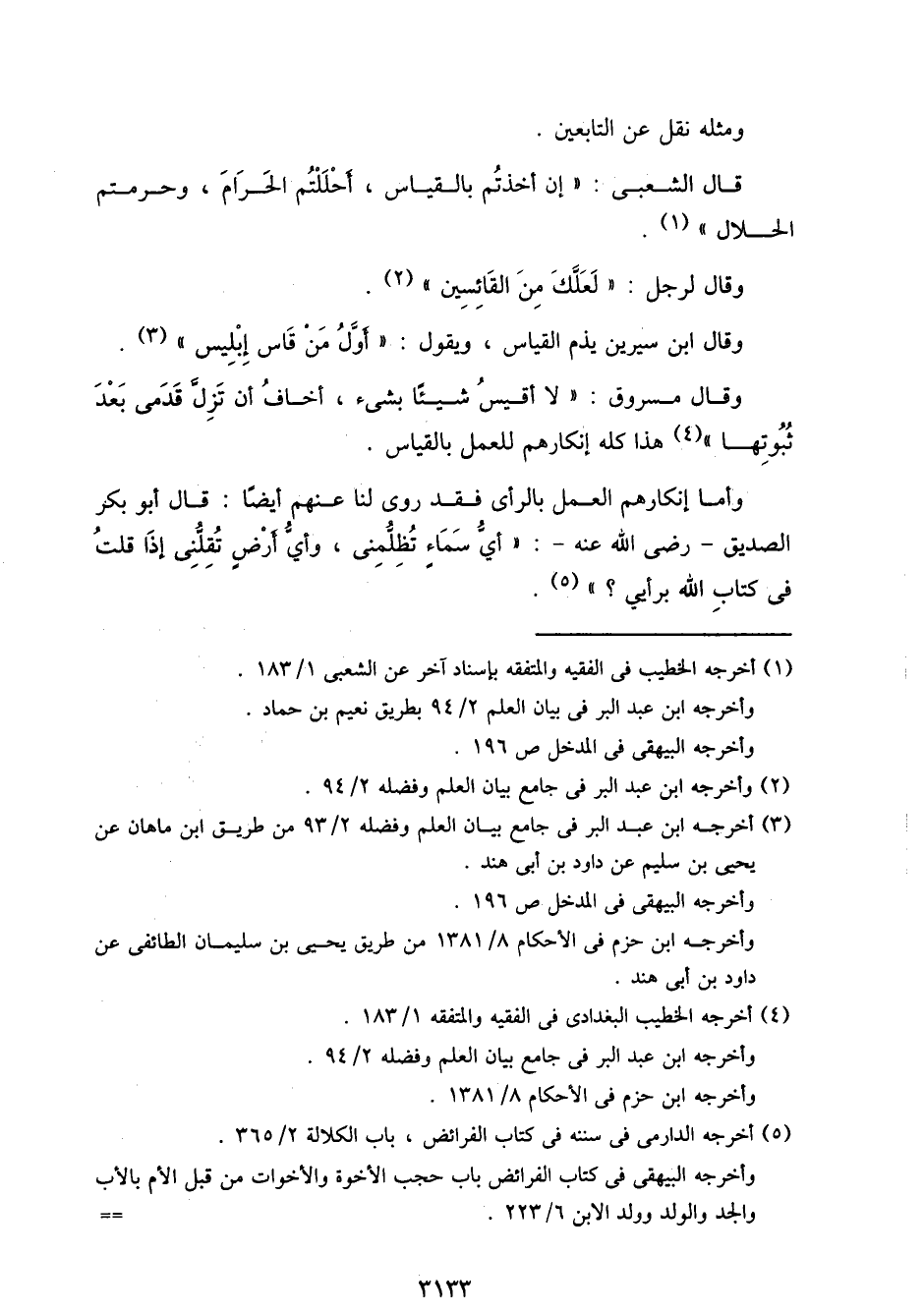 قال الشعبي: "إن أخذتم بالقياس، أحللتم الحرام، وحرمتم الحلال".