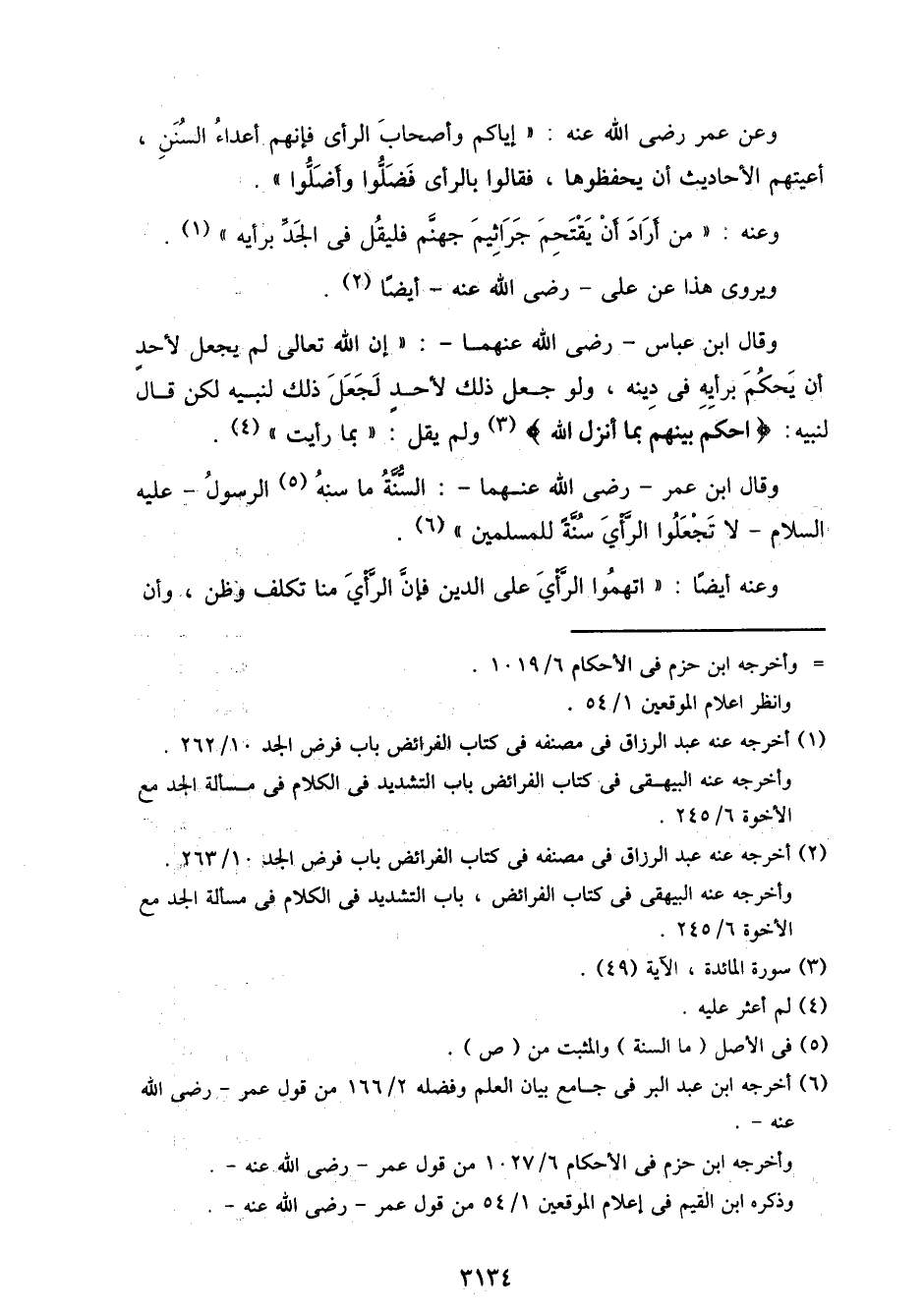 وقال ابن عباس- رضي الله عنهما-:"إن الله تعالى لم يجعل لأحد أن يحكم برأيه في دينه، ولو جعل ذلك لأحد لجعل ذلك لنبيه لكن قال لنبيه: {احكم بينهم بما أنزل الله} ولم يقل:"بما رأيت".