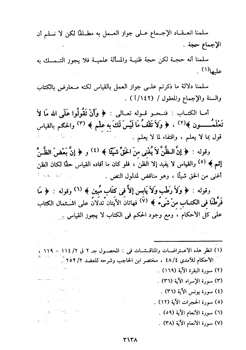 وقوله: {إن الظن لا يغني من الحق شيئًا} و {إن بعض الظن إثم} والقياس لا يفيد إلا الظن، فلو كان ما أفاده القياس حقًا لكان الظن أغنى من الحق شيئًا، وهو مناقض لمدلول النص.