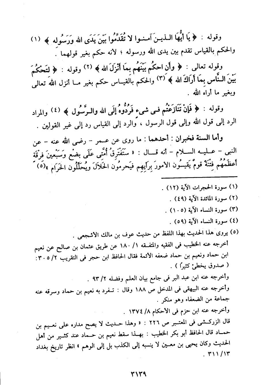 وأما السنة فخبران: أحدهما: ما روي عن عمر- رضي الله عنه- عن النبي-عليه السلام- أنه قال: "ستفترق أمتي على بضع وسبعين فرقة أعظمهم فتنة قوم يقيسون الأمور برأيهم فيحرمون الحلال ويحللون الحرام".