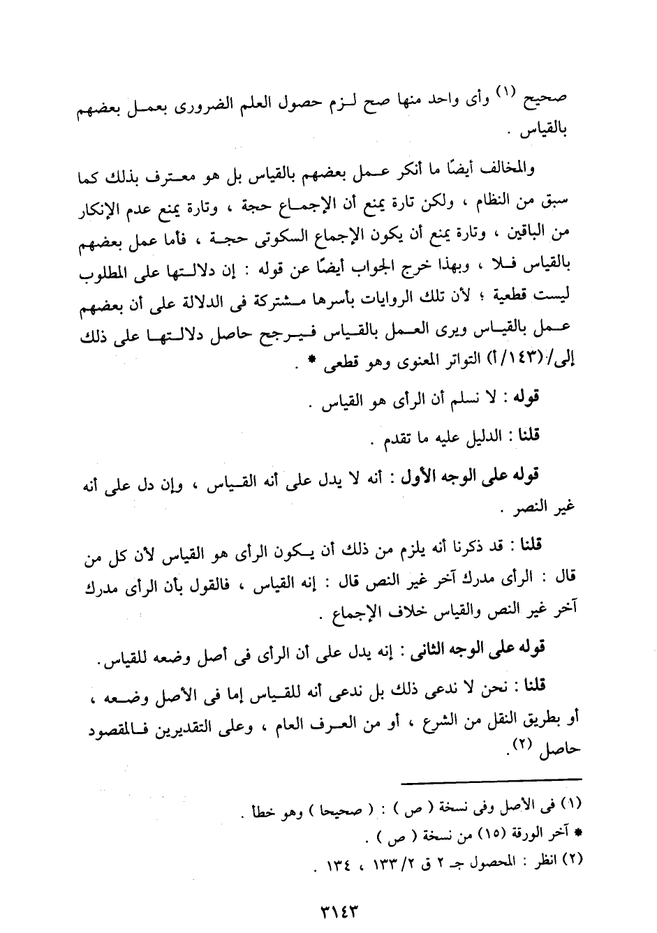 والمخالف أيضًا ما أنكر عمل بعضهم بالقياس بل هو معترف بذلك كما سبق من النظام، ولكن تارة يمنع أن الإجماع حجة، وتارة يمنع عدم الإنكار من الباقين، وتارة يمنع أن يكون الإجماع السكوتي حجة، فأما عمل بعضهم بالقياس فلا، وبهذا خرج الجواب أيضًا عن قوله: إن دلالتها على المطلوب ليست قطعية؛ لأن تلك الروايات بأسرها مشتركة في الدلالة على أن بعضهم عمل القياس ويرى العمل بالقياس فيرجح حاصل دلالتها على ذلك إلى/ (143/ أ) التواتر المعنوي وهو قطعي.