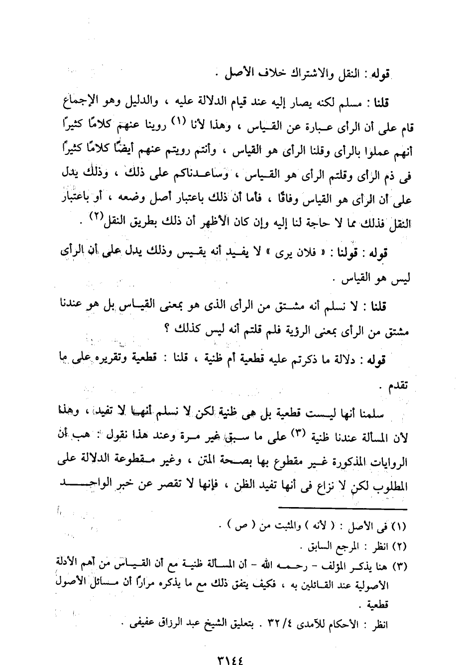 قلنا: مسلم لكنه يصار إليه عند قيام الدلالة عليه، والدليل وهو الإجماع قام على أن الرأي عبارة عن القياس، وهذا لأنا روينا عنهم كلامًا كثيرًا أنهم عملوا بالرأي وقلنا الرأي هو القياس، وأنتم رويتم عنهم أيضًا كلامًا كثيرًا في ذم الرأي وقلتم الرأي هو القياس، وساعدناكم على ذلك، وذلك يدل على أن الرأي هو القياس وفاقًا، فأما أن ذلك باعتبار أصل وضعه، أو باعتبار النقل فذلك مما لا حاجة لنا إليه وإن كان الأظهر أن ذلك بطريق النقل.