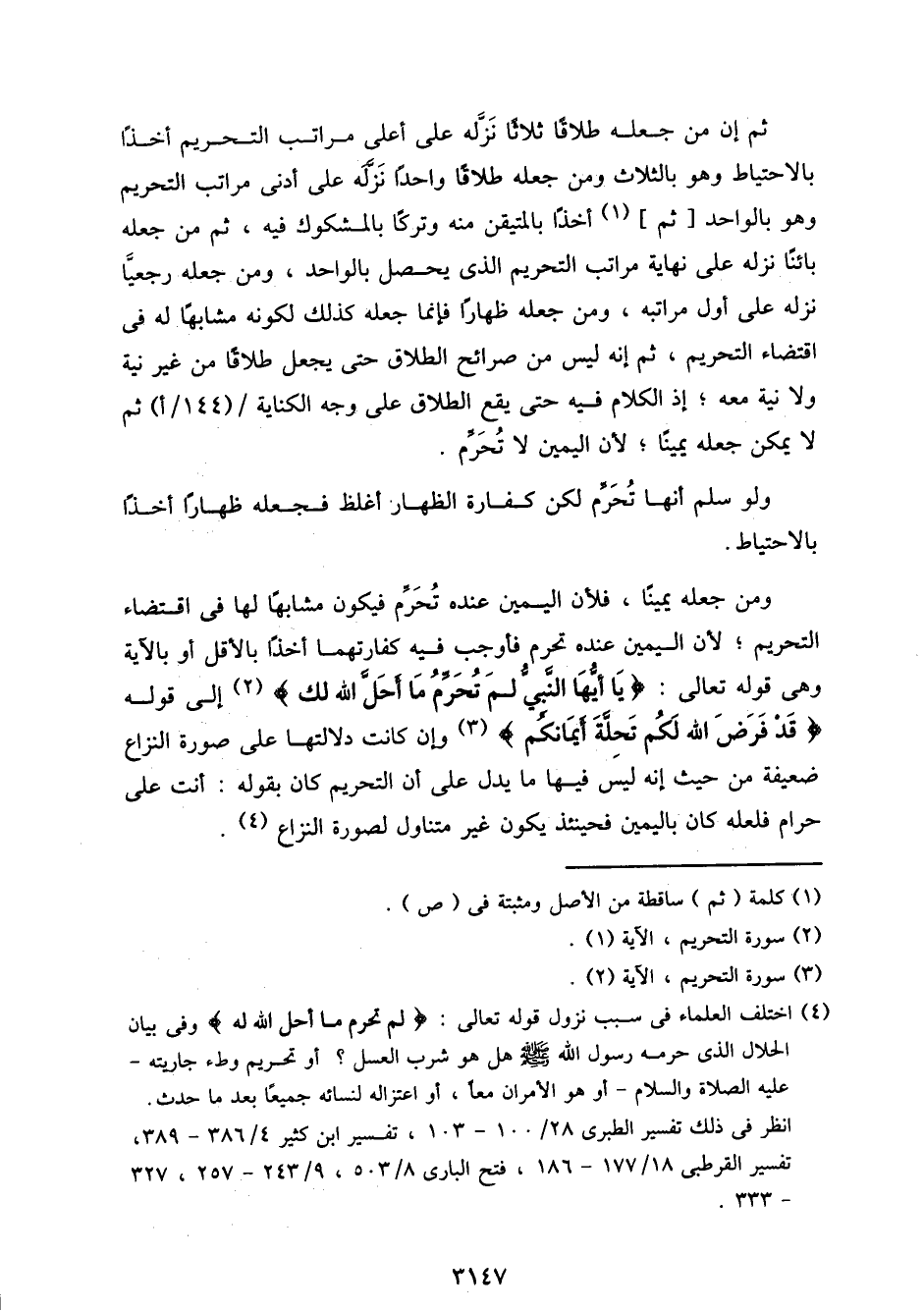 ثم إن من جعله طلاقًا ثلاثًا نزله على أعلى مراتب التحريم أخذًا بالاحتياط وهو بالثلاث ومن جعله طلاقًا واحدًا نزله على أدنى مراتب التحريم وهو بالواحد [ثم] أخذًا بالمتيقن منه وتركًا بالمشكوك فيه، ثم من جعله بائنًا نزله على نهاية مراتب التحريم الذي يحصل بالواحد، ومن جعله رجعيًا نزله على أول مراتبه، ومن جعله ظهارًا فإنما جعله كذلك لكونه مشابهًا له في اقتضاء التحريم، ثم إنه ليس من صرائح الطلاق حتى يجعل طلاقًا من غير نية ولا نية معه؛ إذ الكلام فيه حتى يقع الطلاق على وجه الكناية/ (144/ أ) ثم لا يمكن جعله يمينًا؛ لأن اليمين لا تحرم.
