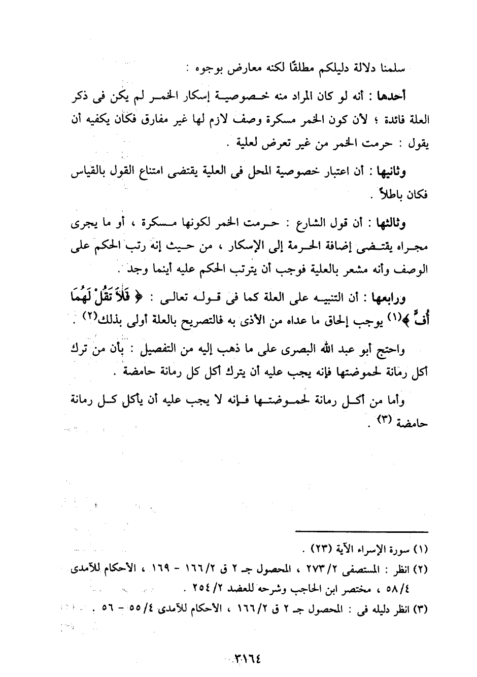 ورابعها: أن التنبيه على العلة كما في قوله تعالى: {فلا تقل لهما أف} يوجب إلحاق ما عداه من الأذى به فالتصريح بالعلة أولى بذلك.