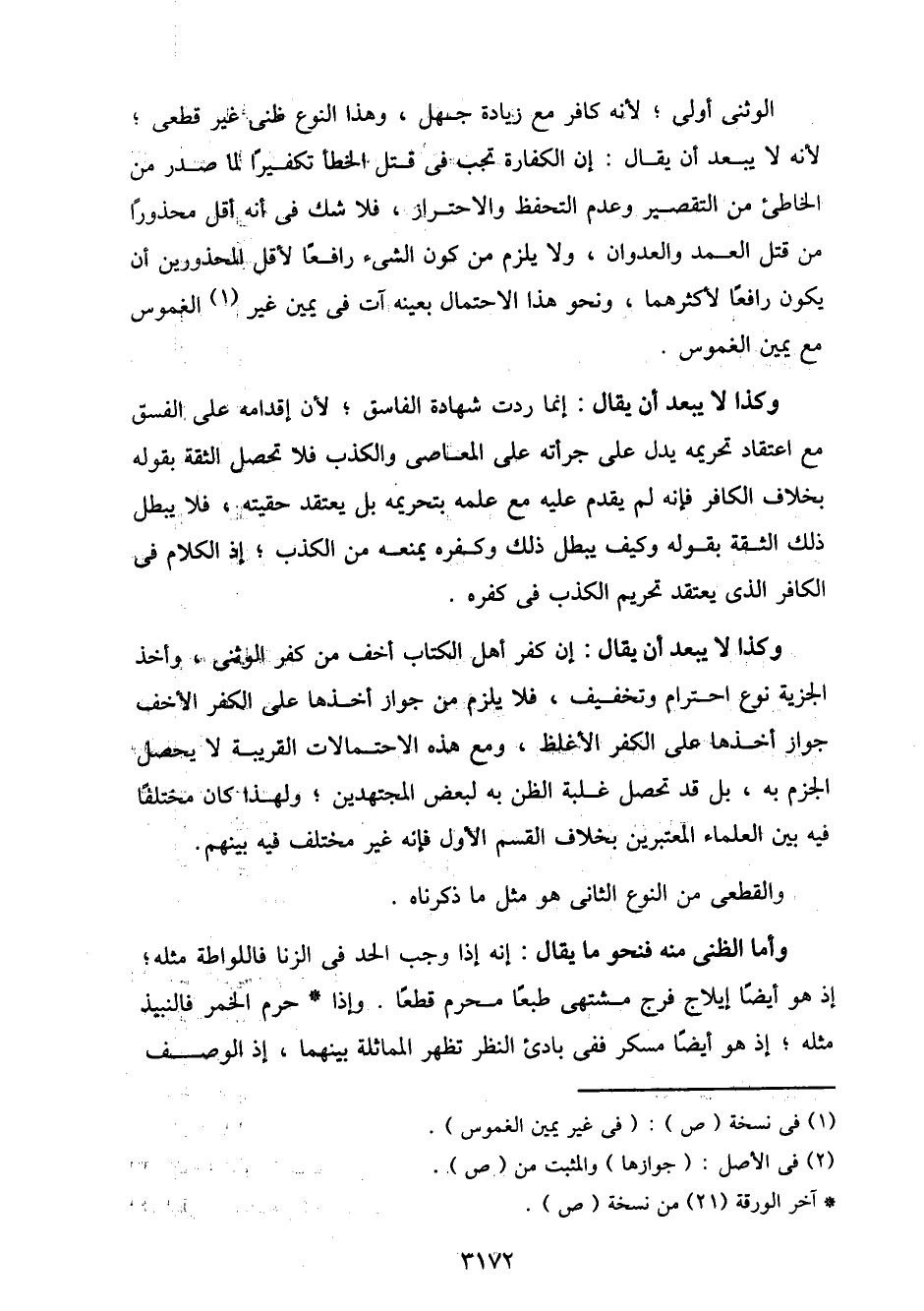 وكذا لا يبعد أن يقال: إن كفر أهل الكتاب أخف من كفر الوثني، وأخذ الجزية نوع احترام وتخفيف، فلا يلزم من جواز أخذها على الكفر الأخف جواز أخذها على الكفر الأغلظ، ومع هذه الاحتمالات القريبة لا يحصل الجزم به، بل قد تحصل غلبة الظن به لبعض المجتهدين؛ ولهذا كان مختلفًا فيه بين العلماء المعتبرين بخلاف القسم الأول فإنه غير مختلف فيه بينهم.