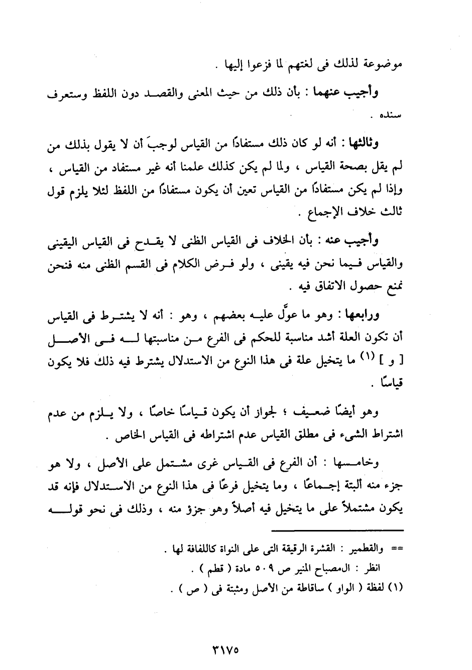 وخامسها: أن الفرع في القياس غير مشتمل على الأصل، ولا هو جزء منه ألبتة إجماعًا، وما يتخيل فرعًا من هذا النوع من الاستدلال فإنه قد يكون مشتملًا على ما يتخيل فيه أصلًا وهو جزء منه، وذلك في نحو قوله