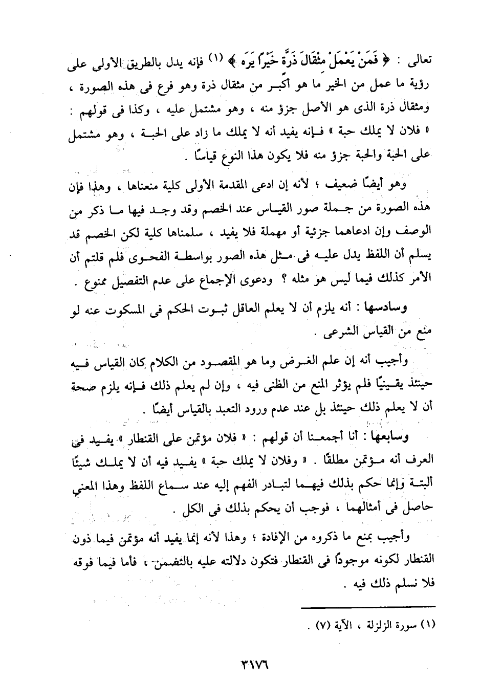 تعالى: {فمن يعمل مثقال ذرة خيرًا يره} فإنه يدل بالطريق الأولى على رؤية ما عمل من الخير ما هو أكبر من مثقال ذرة وهو فرع في هذه الصورة، ومثقال ذرة الذي هو الأصل جزء منه، وهو مشتمل عليه، وكذا في قولهم: "فلان لا يملك حبة" فإنه يفيد أنه لا يملك ما زاد على الحبة، وهو مشتمل على الحبة والحبة جزء منه فلا يكون هذا النوع قياسًا.
