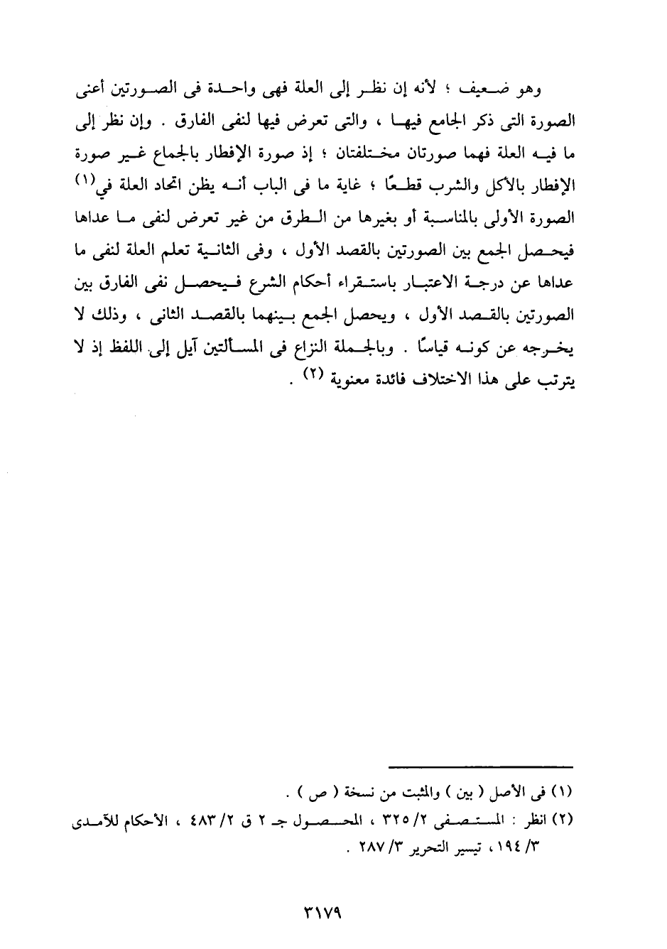 وهو ضعيف؛ لأنه إن نظر إلى العلة فهي واحدة في الصورتين أعنى الصورة التي ذكر الجامع فيها، والتي تعرض فيها لنفي الفارق. وإن نظر إلى ما فيه العلة فهما صورتان مختلفتان؛ إذ صورة الإفطار بالجماع غير صورة الإفطار بالأكل والشراب قطعًا؛ غاية ما في الباب إنه يظن اتحاد العلة في الصورة الأولى بالمناسبة أو بغيرها من الطرق من غير تعرض لنفي ما عداها فيحصل الجمع بين الصورتين بالقصد الأول، وفي الثانية تعلم العلة لنفي ما عداها من درجة الاعتبار باستقراء أحكام الشرع فيحصل نفي الفارق بين الصورتين بالقصد الأول، ويحصل الجمع بينهما بالقصد الثاني، وذلك لا يخرجه كونه قياسًا. وبالجملة النزاع في المسألتين آيل إلى اللفظ إذ لا يترتب على هذا الاختلاف فائدة معنوية.
