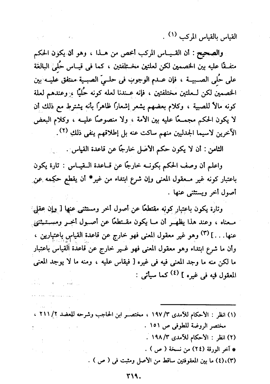 والصحيح: أن القياس المركب أخص من هذا، وهو أن يكون الحكم متفقًا عليه بين الخصمين لكن لعلتين مختلفتين، كما في قياس حلى البالغة على حلى الصبية، فأن عدم الوجوب في حلي الصبية متفق عليه بين الخصمين لكن لعلتين مختلفتين، فإن عندما لعله كونه حليًا، وعندهم لعلة كونه مالًا للصبية، وكلام بعضهم يشعر إشعارًا ظاهرًا بأنه يشترط مع ذلك أن لا يكون الحكم مجمعًا عليه بين الأمة، ولا منصوصًا عليه، وكلام البعض الآخرين لاسيما الجدليين منهم ساكت عنه بل إطلاقهم ينفي ذلك.