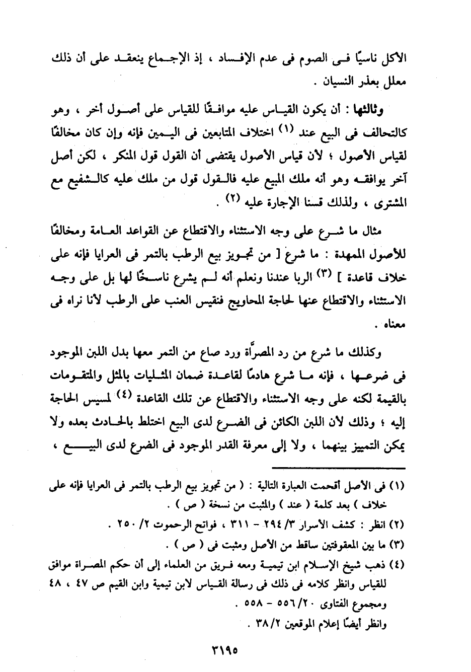 مثال ما شرع على وجه الاستثناء والاقتطاع عن القواعد العامة ومخالفًا للأصول الممهدة: ما شرع [من تجويز بيع الرطب بالتمر في العرايا فإنه على خلاف قاعدة] الربا عندنا ونعلم أنه لم يشرع ناسخًا لها بل على وجه الاستثناء والاقتطاع عنها لحاجة المحاويج فنقيس العنب على الرطب لأنا نراه في معناه.