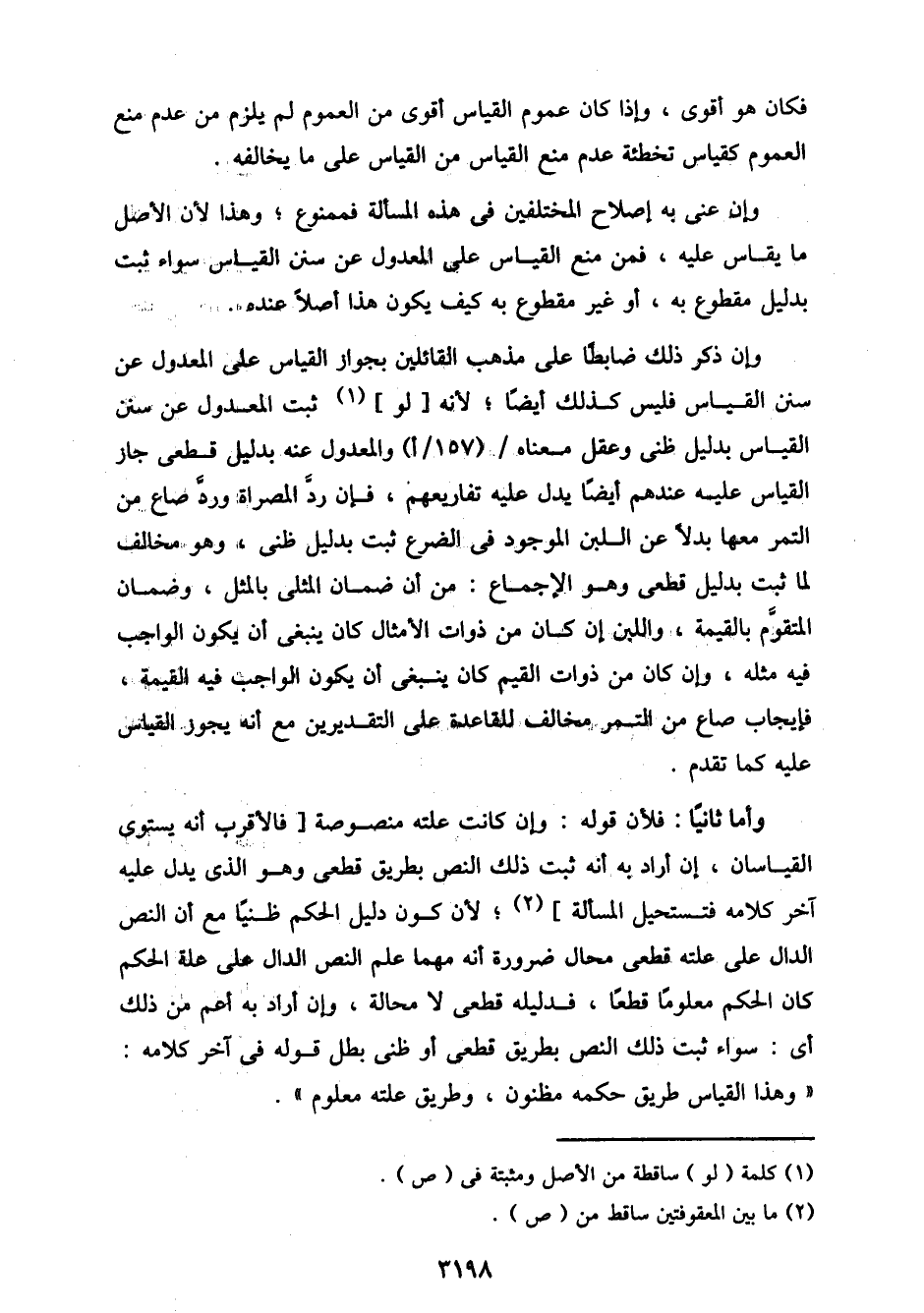 وأما ثانيًا: فلأن قوله: وإن كانت علته منصوصة [فالأقرب أنه يستوي القياسان، إن أراد به أن يثبت ذلك النص بطريق قطعي وهو الذي يدل عليه آخر كلامه فتستحيل المسألة]؛ لأن كون دليل الحكم ظنيًا مع أن النص الدال على علته قطعي محال ضرورة أنه مهما علم النص الدال على علة الحكم كان الحكم معلومًا قطعًا، فدليله قطعي لا محالة، وإن أراد به أعم من ذلك أي: سواء ثبت ذلك النص بطريق قطعي أو ظني بطل قوله في آخر كلامه: "وهذا القياس طريق حكمه مظنون، وطريق علته معلوم".