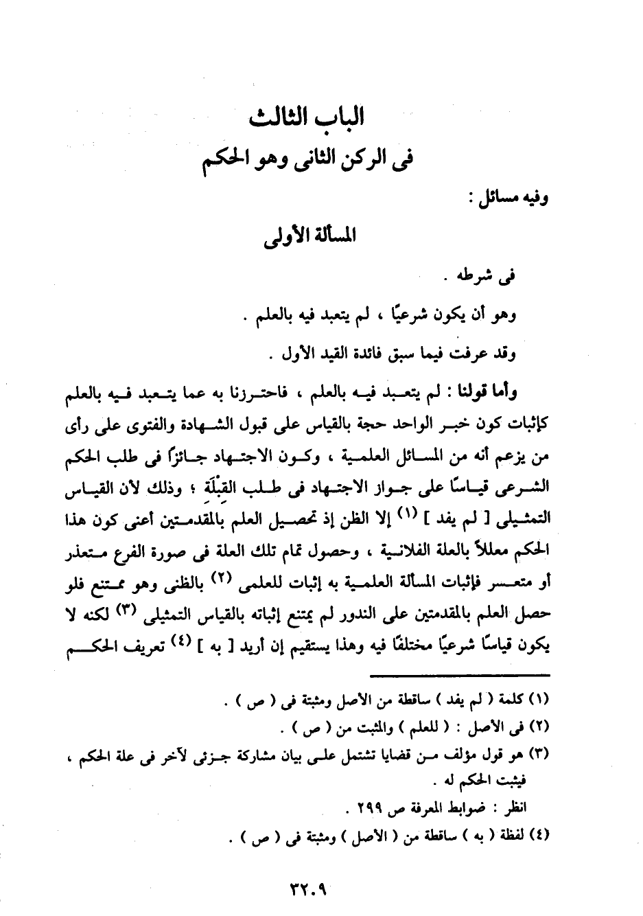 وأما قولنا: لم يتعبد فيه بالعلم، فاحترزنا به عما يتعبد فيه بالعلم كإثبات كون خبر الواحد حجة بالقياس على قبول الشهادة والفتوى على رأى من يزعم أنه من المسائل العلمية، وكون الاجتهاد جائزًا في طلب الحكم الشرعي قياسًا على جواز الاجتهاد في طلب القبلة؛ وذلك لان القياس التمثيلي [لم يفد] إلا الظن إذ تحصيل العلم بالمقدمتين أعنى كون هذا الحكم معللًا بالعلة الفلانية، وحصول تمام تلك العلة في صورة الفرع متعذر أو متعسر فإثبات المسألة العلمية به إثبات للعلمى بالظنى وهو ممتنع فلو حصل العلم بالمقدمتين على الندور لم يمتنع إثباته بالقياس التمثيلي لكنه لا يكون قياسًا شرعيًا مختلفًا فيه وهذا يستقيم إن أريد [به] تعريف الحكم