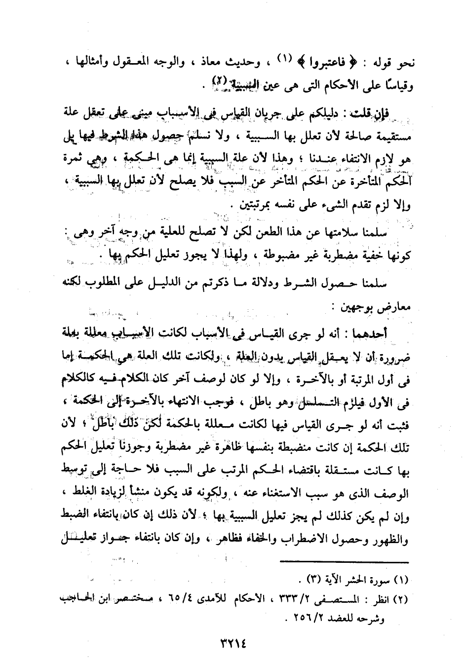 أحدهما: أنه لو جرى القياس في الأسباب لكانت الأسباب معللة بعلة ضرورة أن لا يعقل القياس بدون العلة، ولكانت تلك العلة هي الحكمة إما في أول المرتبة أو بالآخرة، وإلا لو كان لوصف آخر كان الكلام فيه كالكلام في الأول فيلزم التسلسل وهو باطل، فوجب الانتهاء بالآخرة إلى الحكمة، فثبت أنه لو جرى القياس فيها لكانت معللة بالحكمة لكن ذلك باطل؛ لأن تلك الحكمة إن كانت منضبطة بنفسها ظاهرة غير مضطربة وجوزنا تعليل الحكم بها كانت مستقلة باقتضاء الحكم المرتب على السبب فلا حاجة إلى توسط الوصف الذى هو سبب الاستغناء عنه، ولكونه قد يكون منشأ لزيادة الغلط، وإن لم يكن كذلك لم يجز تعليل السببية بها؛ لأن ذلك لم إن كان بانتفاء الضبط والظهور وحصول الاضطراب والخفاء فظاهر، وإن كان بانتفاء جواز تعليل