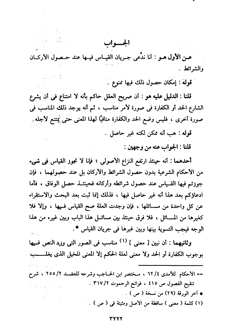أحدهما: أنه حينئذ ارتفع النزاع الأصولي؛ فإنا لا نجوز القياس في شيء من الأحكام الشرعية بدون حصول الشرائط والأركان بل عند حصولهما، فإن جوزتم فيها القياس عند حصول شرائطه وأركانه فحينئذ حصل الوفاق، فإما ادعاؤكم بعد هذا أنه غير حاصل فيها، فذلك إنما ثبت بعد البحث والاستقراء أن عن كل واحدة من مسائلها، فإن وجدت العلة صح القياس فيها، وإلا فلا كغيرها من المسائل، فلا فرق حينئذ بين مسائل هذا الباب وبين غيره من هذا الوجه فيجب التسوية بينها وبين غيرها في جريان القياس.