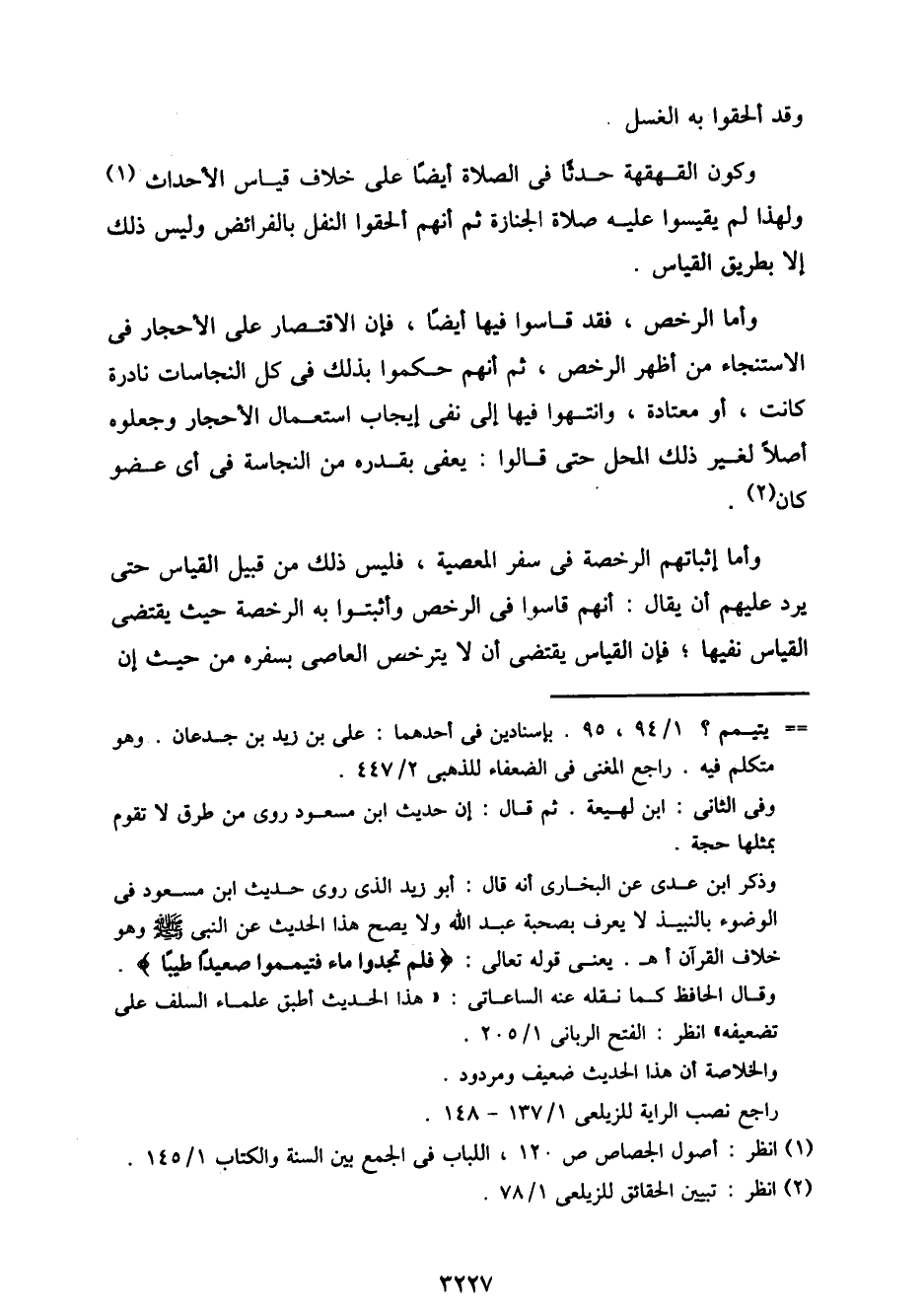 وأما الرخص، فقد قاسوا فيها أيضًا، فإن الاقتصار على الأحجار في الاستنجاء من أظهر الرخص، ثم أنهم حكموا بذلك في كل النجاسات نادرة كانت، أو معتادة، وانتهوا فيها إلى نفى إيجاب استعمال الأحجار وجعلوه أصلًا لغير ذلك المحل حتى قالوا: يعفى بقدره من النجاسة في أي عضو كان.