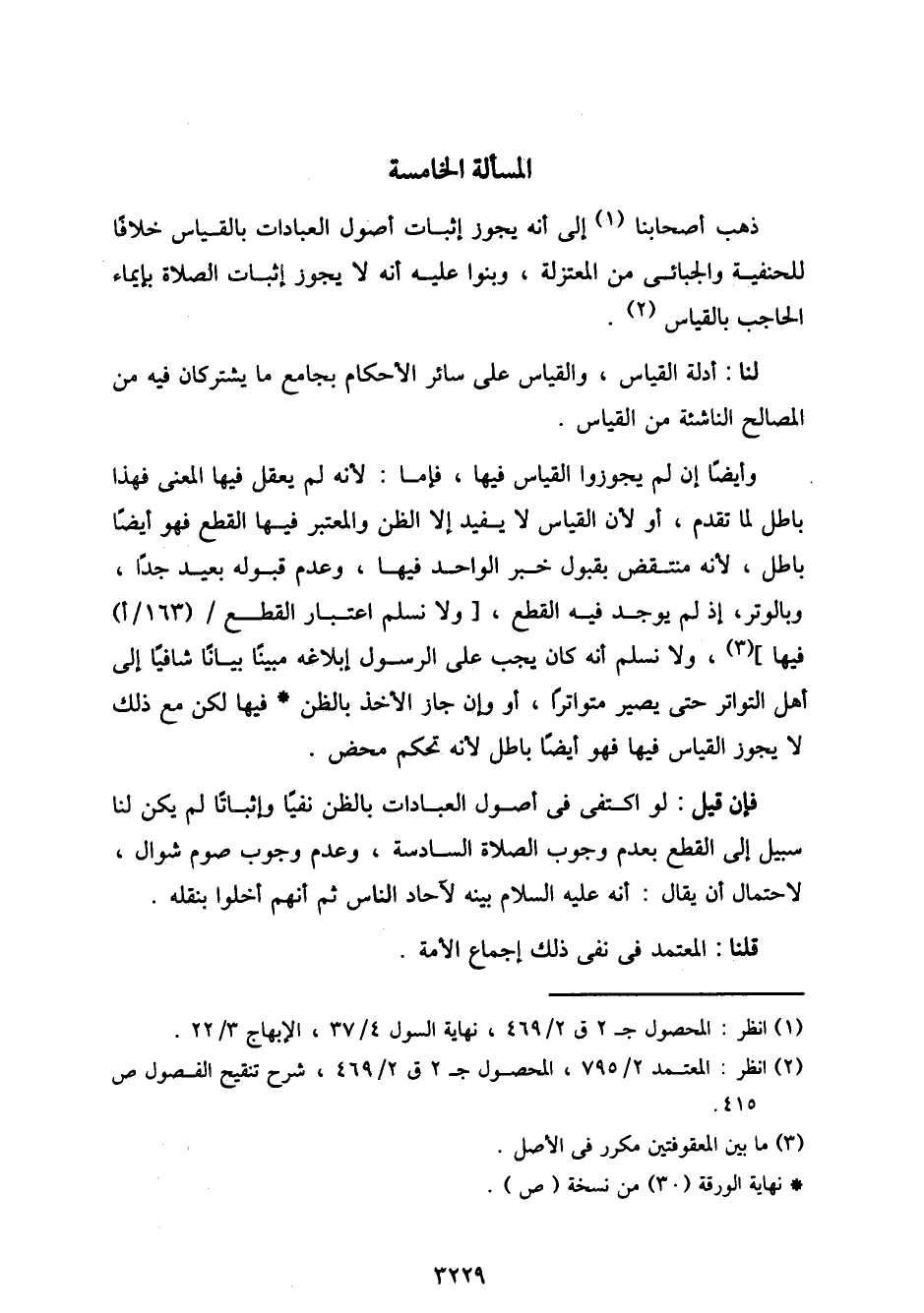 وأيضًا إن لم يجوزوا القياس فيها، فإما: لأنه لم يعقل فيها المعنى فهذا باطل لما تقدم، أو لأن القياس لا يفيد إلا الظن والمعتبر فيها القطع فهو أيضًا باطل، لأنه منتقض بقبول خبر الواحد فيها، وعدم قبوله بعيد جدًا، وبالوتر، إذ لم يوجد فيه القطع، [ولا نسلم اعتبار القطع/ (167 / أ) فيها]، ولا نسلم أنه كان يجب على الرسول إبلاغه مبينًا بيانًا شافيًا إلى أهل التواتر حتى يصير متواترًا، أو وإن جاز الأخذ بالظن فيها لكن مع ذلك لا يجوز القياس فيها فهو أيضًا باطل لأنه تحكم محض.