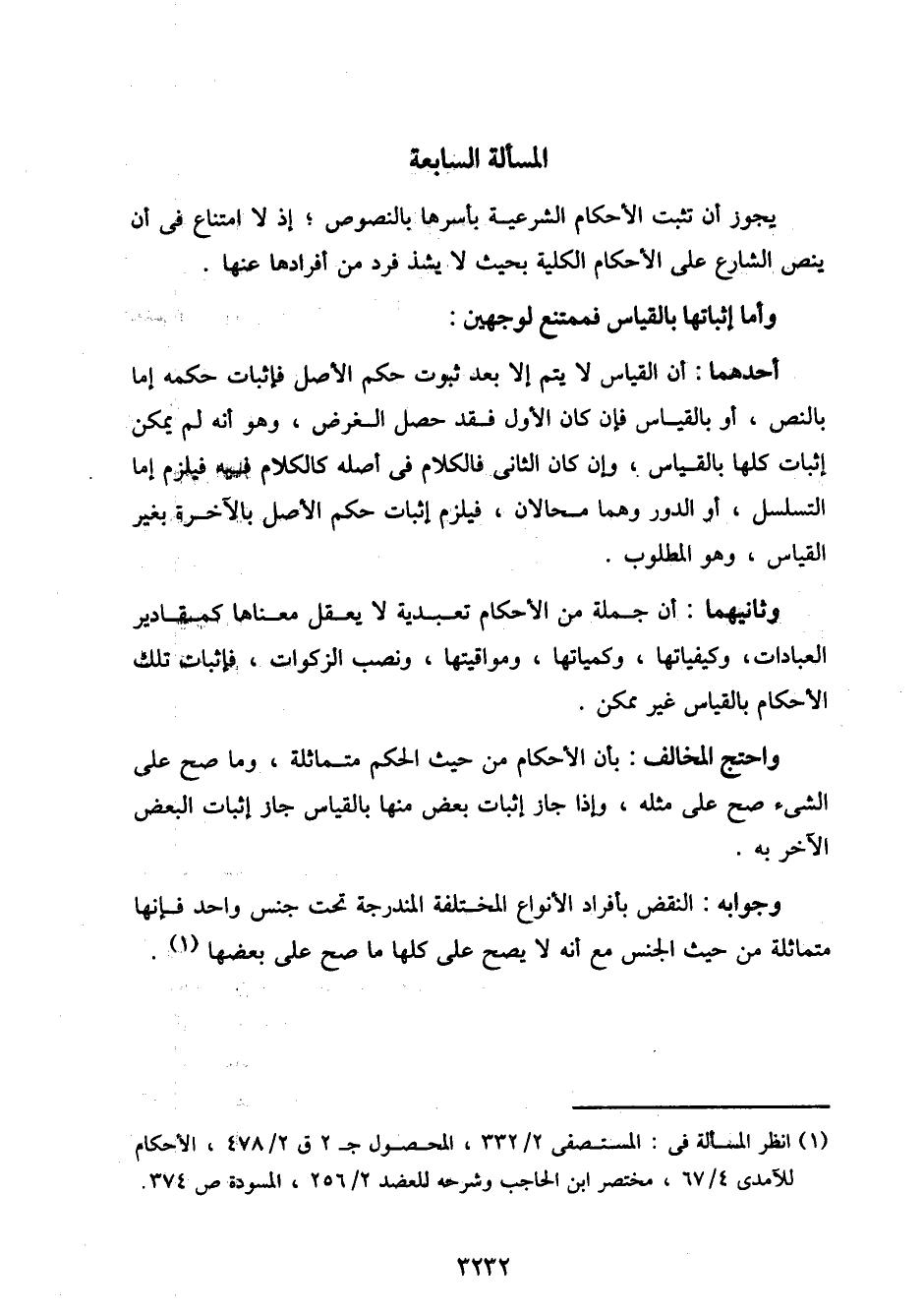 أحدهما: أن القياس لا يتم إلا بعد ثبوت حكم الاصل فإثبات حكمه إما بالنص، أو بالقياس فإن كان الأول فقد حصل الغرض، وهو أنه لم يمكن إثبات كلها بالقياس، وإن كان الثاني فالكلام في أصله كالكلام فيه فيلزم إما التسلسل، أو الدور وهما محالان، فيلزم إثبات حكم الأصل بالآخرة بغير القياس، وهو المطلوب.