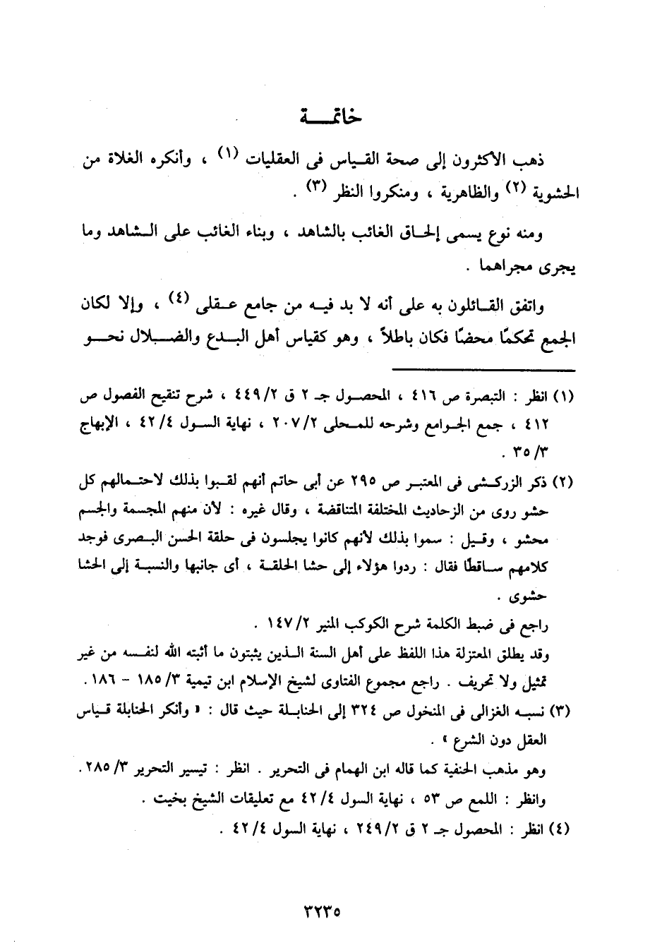 ذهب الأكثرون إلى صحة القياس في العقليات، وأنكره الغلاة من الحشوية والظاهرية، ومنكروا النظر.
