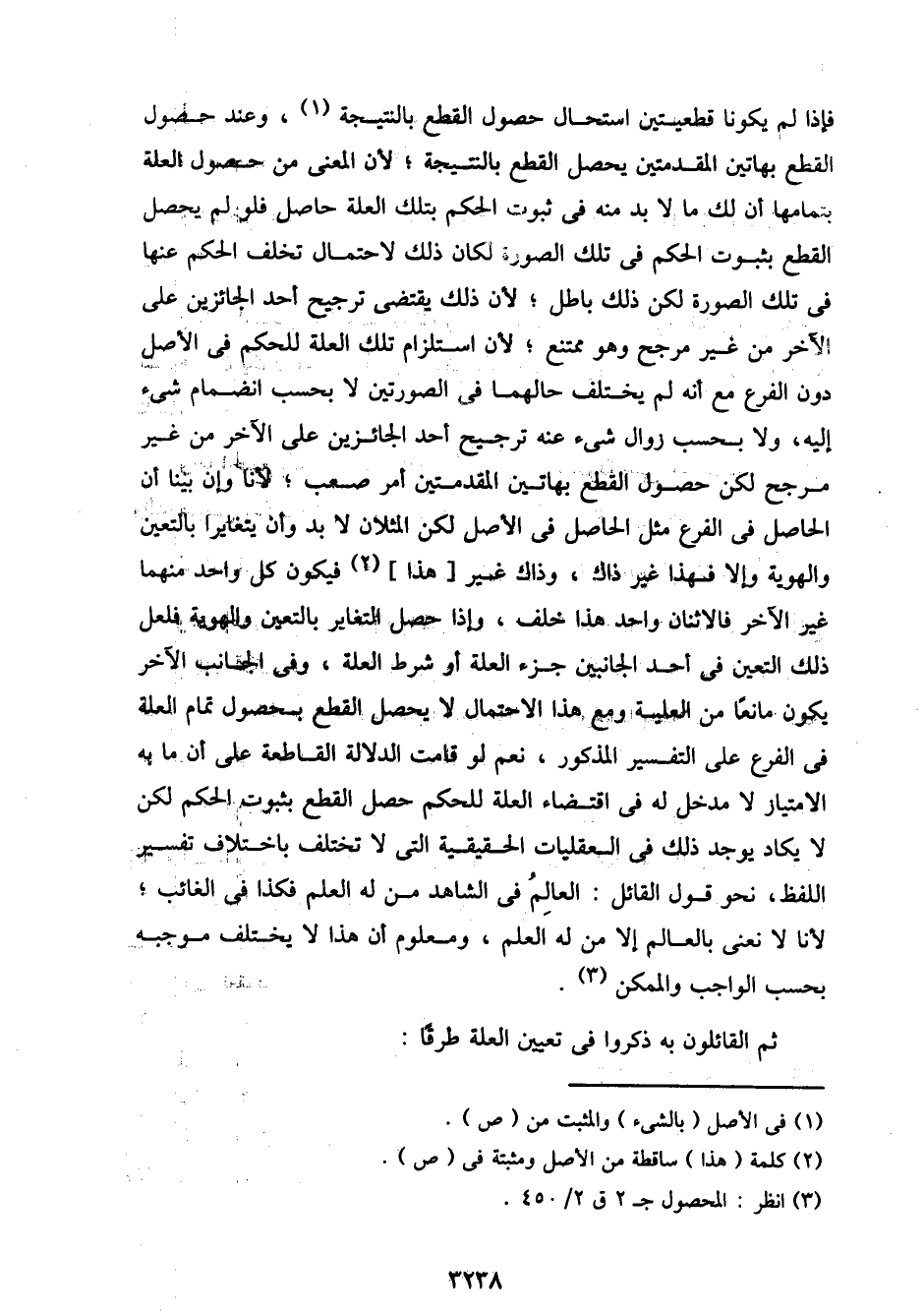 فإذا لم يكونا قطعيتين استحال حصول القطع بالنتيجة، وعند حصول القطع بهاتين المقدمتين يحصل القطع بالنتيجة؛ لأن المعنى من حصول العلة بتمامها أن لك ما لا بد منه في ثبوت الحكم بتلك العلة حاصل فلو لم يحصل القطع بثبوت الحكم في تلك الصورة لكان ذلك لاحتمال تخلف الحكم عنها في تلك الصورة لكن ذلك باطل؛ لأن ذلك يقتضي ترجيح أحد الجائزين على الآخر من غير مرجح وهو ممتنع؛ لأن استلزام تلك العلة للحكم في الأصل دون الفرع مع أنه لم يختلف حالهما في الصورتين لا بحسب انضمام شيء إليه، ولا بحسب زوال شيء عنه ترجيح أحد الجائزين على الآخر من غير مرجح لكن حصول القطع بهاتين المقدمتين أمر صعب؛ لأنا وإن بينا أن الحاصل في الفرع مثل الحاصل في الاصل لكن المثلان لابد وأن يتغايرا بالتعين والهوية وإلا فهذا غير ذاك، وذاك غير [هذا] فيكون كل واحد منهما غير الأخر فالاثنان واحد هذا خلف، وإذا حصل التغاير بالتعين والهوية فلعل ذلك التعين في أحد الجانبين جزء العلة أو شرط العلة، وفي الجانب الآخر يكون مانعًا من العلية ومع هذا الاحتمال لا يحصل القطع بحصول تمام العلة في الفرع على التفسير المذكور، نعم لو قامت الدلالة القاطعة على أن ما به الامتياز لا مدخل له في اقتضاء العلة للحكم حصل القطع بثبوت الحكم لكن لا يكاد يوجد ذلك في العقليات الحقيقية التي لا تختلف باختلاف تفسير اللفظ، نحو قول القائل: العالم في الشاهد من له العلم فكذا في الغائب؛ لأنا لا نعني بالعالم إلا من له العلم، ومعلوم أن هذا لا يختلف موجبه بحسب الواجب والممكن.