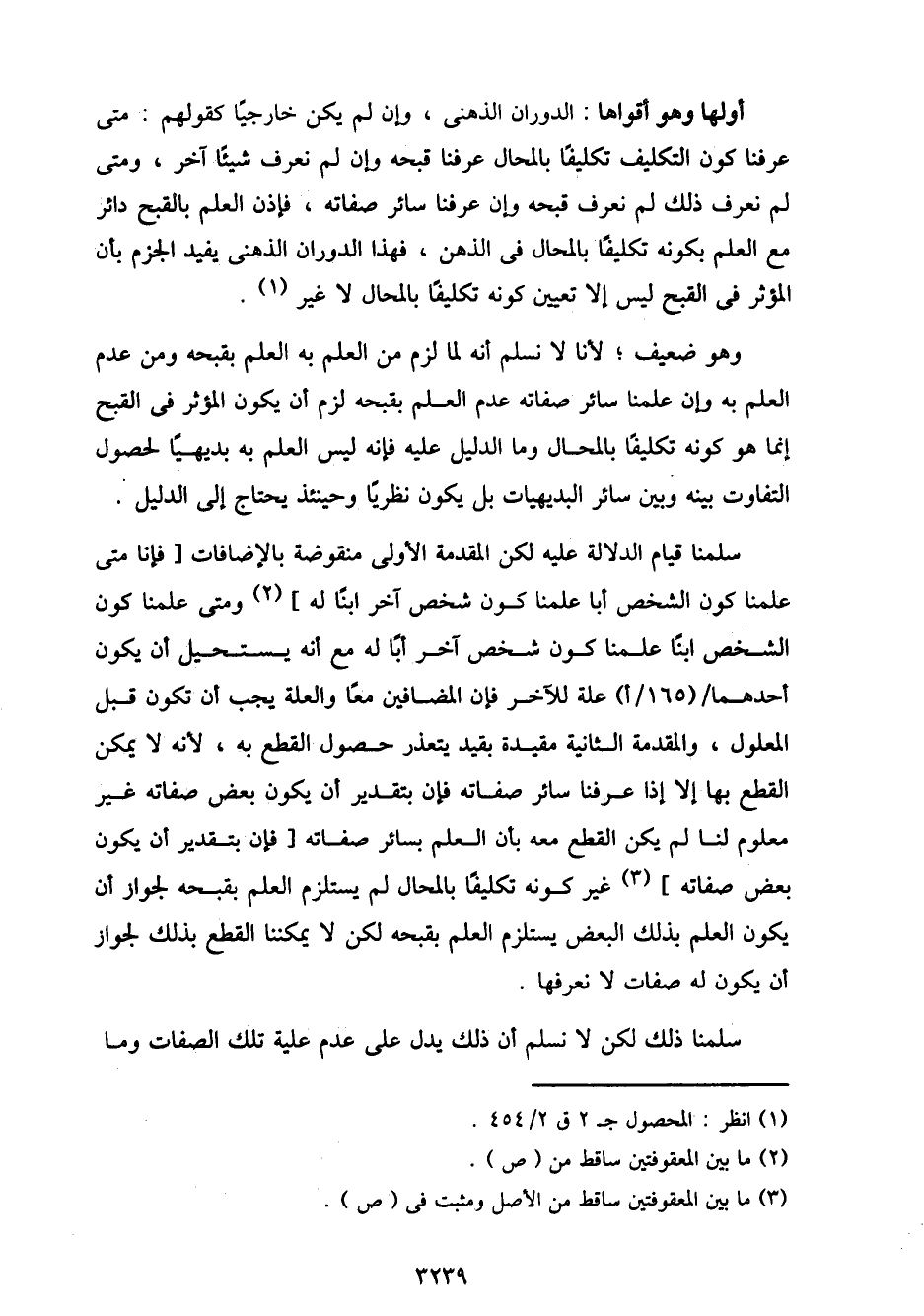 سلمنا قيام الدلالة عليه لكن المقدمة الأولى منقوضة بالإضافات [فإنا متى علمنا كون الشخص أبا علمنا كون شخص آخر ابنًا له] ومتى علمنا كون الشخص ابنًا علمنا كون شخص آخر ابًا له مع أنه يستحيل أن يكون احدهما/ (165/ أ) علة للآخر فإن المضافين معًا والعلة يجب أن تكون قبل المعلول، والمقدمة الثانية مقيدة بقيد يتعذر حصول القطع به، لأنه لا يمكن القطع بها إلا إذا عرفنا سائر صفاته فإن بتقدير أن يكون بعض صفاته غير معلوم لنا لم يكن القطع معه بأن العلم بسائر صفاته [فإن بتقدير أن يكون بعض صفاته] غير كونه تكليفًا بالمحال لم يستلزم العلم بقبحه لجواز أن يكون العلم بذلك البعض يستلزم العلم بقبحه لكن لا يمكننا القطع بذلك لجواز أن يكون له صفات لا نعرفها.