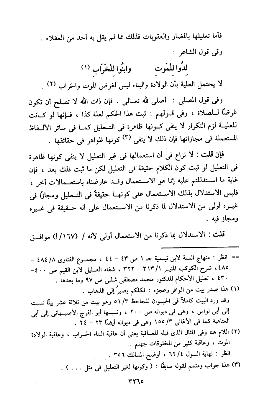 فإن قلت: لا نزع في أن استعمالها في غير التعليل لا ينفي كونها ظاهرة في التعليل لو ثبت كون الكلام حقيقة في التعليل لكن ما ثبت ذلك بعد، فإن غاية ما استدللتم عليه إنما هو الاستعمال وقد عارضناه باستعمالات أخر، فليس الاستدلال بذلك الاستعمال على كونها حقيقة في التعليل ومجازًا في غيره أولى من الاستدلال لما ذكرنا من الاستعمال على أنه حقيقة في غيره ومجاز فيه.