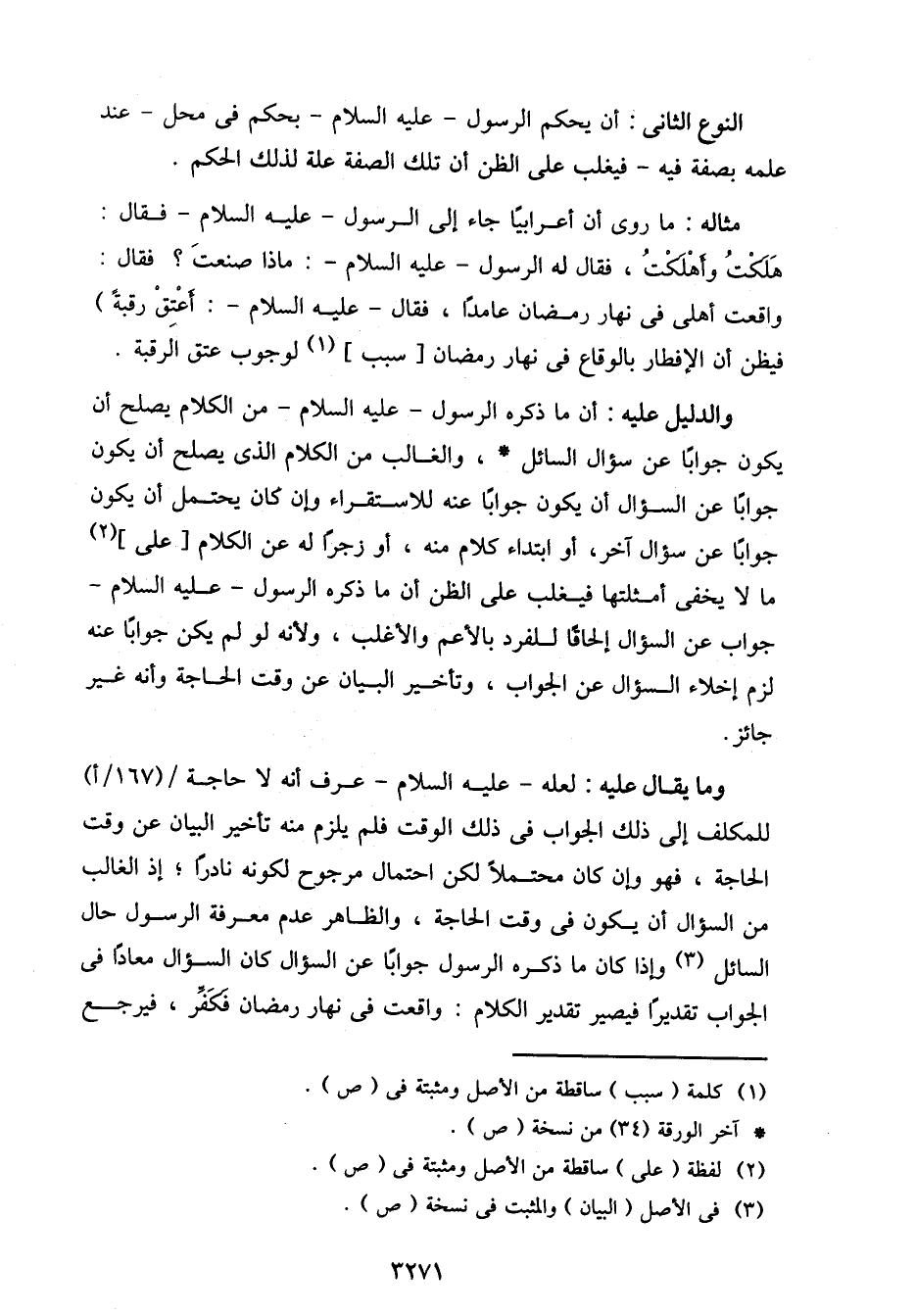 وما يقال عليه: لعله- عليه السلام- عرف أنه لا حاجة/ (167/أ) للمكلف إلى ذلك الجواب في ذلك الوقت فلم يلزم منه تأخير البيان عن وقت الحاجة، فهو وإن كان محتملًا لكن احتمال مرجوح لكونه نادرًا؛ إذ الغالب من السؤال أن يكون في وقت الحاجة، والظاهر عدم معرفة الرسول حال السائل وإذا كان ما ذكره الرسول جوابًا عن السؤال كان السؤال معادًا في الجواب تقديرًا فيصير تقدير الكلام: واقعت في نهار رمضان فكفر، فيرجع
