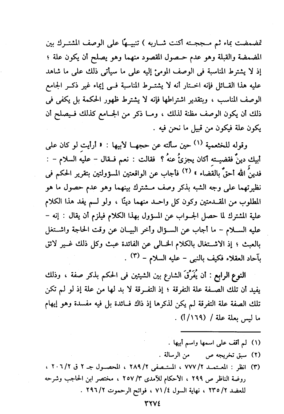 وقوله للخثعمية حين سألته عن حجها لأبيها: "أرأيت لو كان على أبيك دين فقضيته أكان يجزئ عنه؟ فقالت: نعم فقال - عليه السلام -: فدين الله أحق بالقضاء" فأجاب عن الواقعتين المسئولتين بتقرير الحكم في نظيرتهما على وجه الشبه بذكر وصف مشترك بينهما وهو عدم حصول ما هو المطلوب من المقدمتين وكون كل واحد منهما دينا، ولو لم يفد هذا الكلام علية المشترك لما حصل الجواب عن المسؤول بهذا الكلام فيلزم أن يقال: إنه- عليه السلام- ما أجاب عن السؤال وأخر البيان عن وقت الحاجة واشتغل بالعبث؛ إذ الاشتغال بالكلام الخالي عن الفائدة عبث وكل ذلك غير لائق بآحاد العقلاء فكيف بالنبي- عليه السلام -.