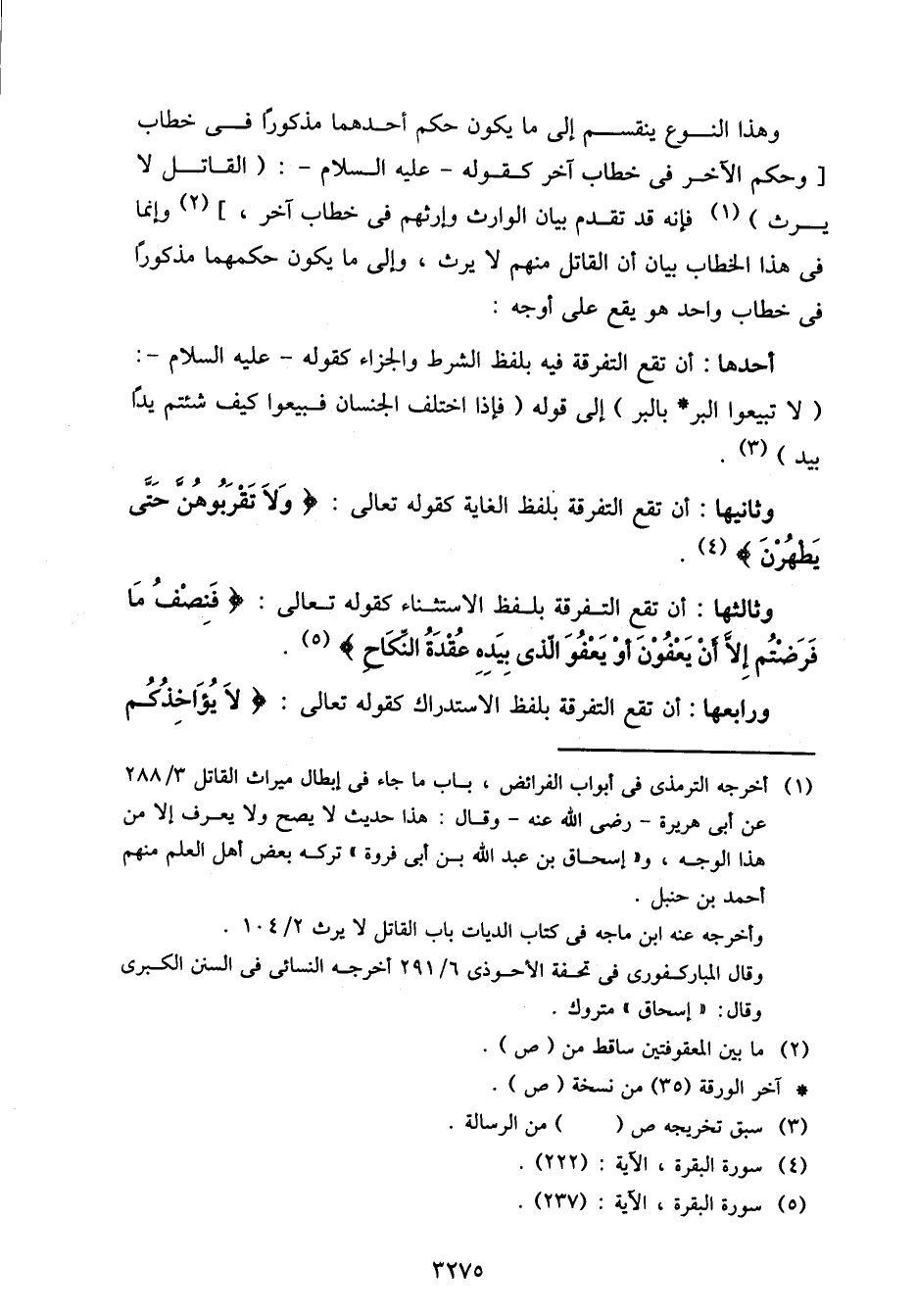 وهذا النوع ينقسم إلى ما يكون حكم أحدهما مذكورًا في خطاب [وحكم الآخر في خطاب آخر كقوله - عليه السلام -: (القاتل لا يرث) فإنه قد تقدم بيان الوارث وإرثهم في خطاب آخر،] وإنما في هذا الخطاب بيان أن القاتل منهم لا يرث، وإلى ما يكون حكمهما مذكورًا في خطاب واحد هو يقع على أوجه:
