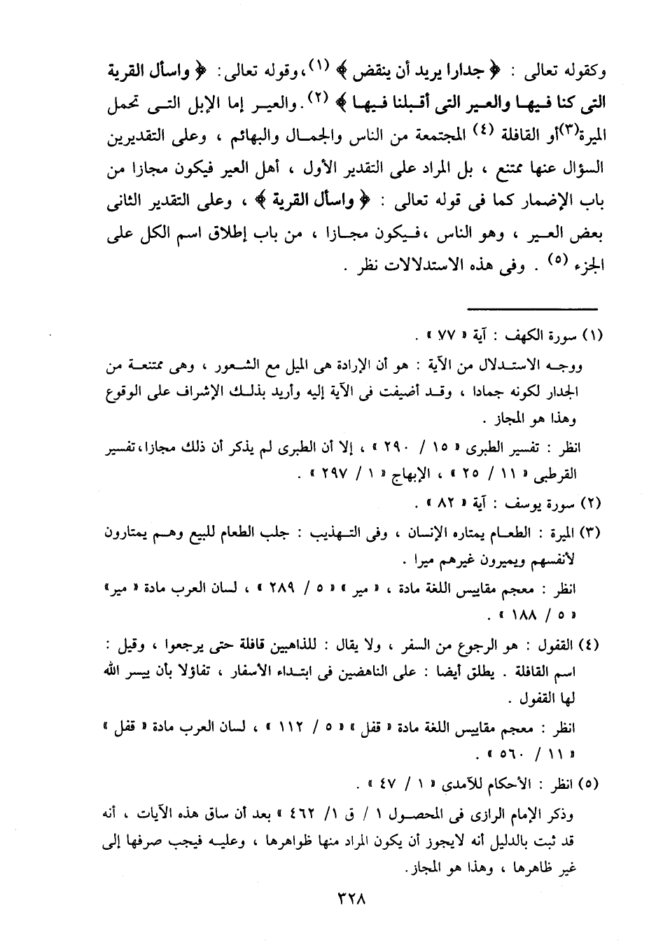 وكقوله تعالى: {جدارا يريد إن ينقض}، وقوله تعالى: {واسأل القرية التي كنا فيها والعير التي أقبلنا فيها}. والعير إما الإبل التي تحمل الميرة أو القافلة المجتمعة من الناس والجمال والبهائم، وعلى التقديرين السؤال عنها ممتنع، بل المراد على التقدير الأول، أهل العير فيكون مجازا من باب الإضمار كما في قوله تعالى: {واسأل القرية}، وعلى التقدير الثاني بعض العير، وهو الناس، فيكون مجازا، من باب إطلاق اسم الكل على الجزء. وفي هذه الاستدلالات نظر.